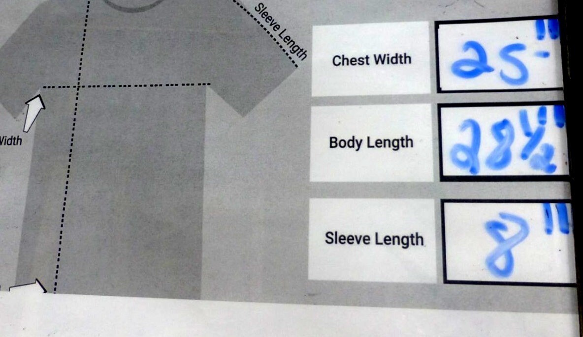 Chest Width = 25 Inches, Body Length = 28.5 Inches, Sleeve Length = 8 Inches