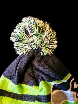 Seattle Seahawks NFL knit pom beanie featuring bold ?Seahawks? spell-out design, team logo, and striped crown. Navy blue base with lime green, gray, and white accents. Cuffed style with pom on top.