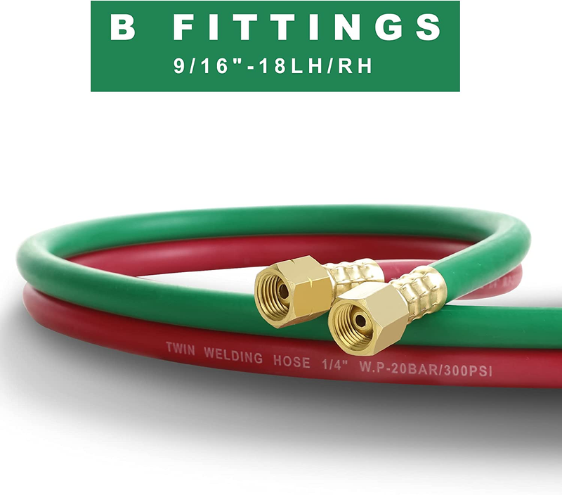 B FITTINGS: We equipment B fittings in both ends which fits for most welding torch and regulators. Fitting Sizes: 9/16"-18 LH and 9/16"-18 RH.
