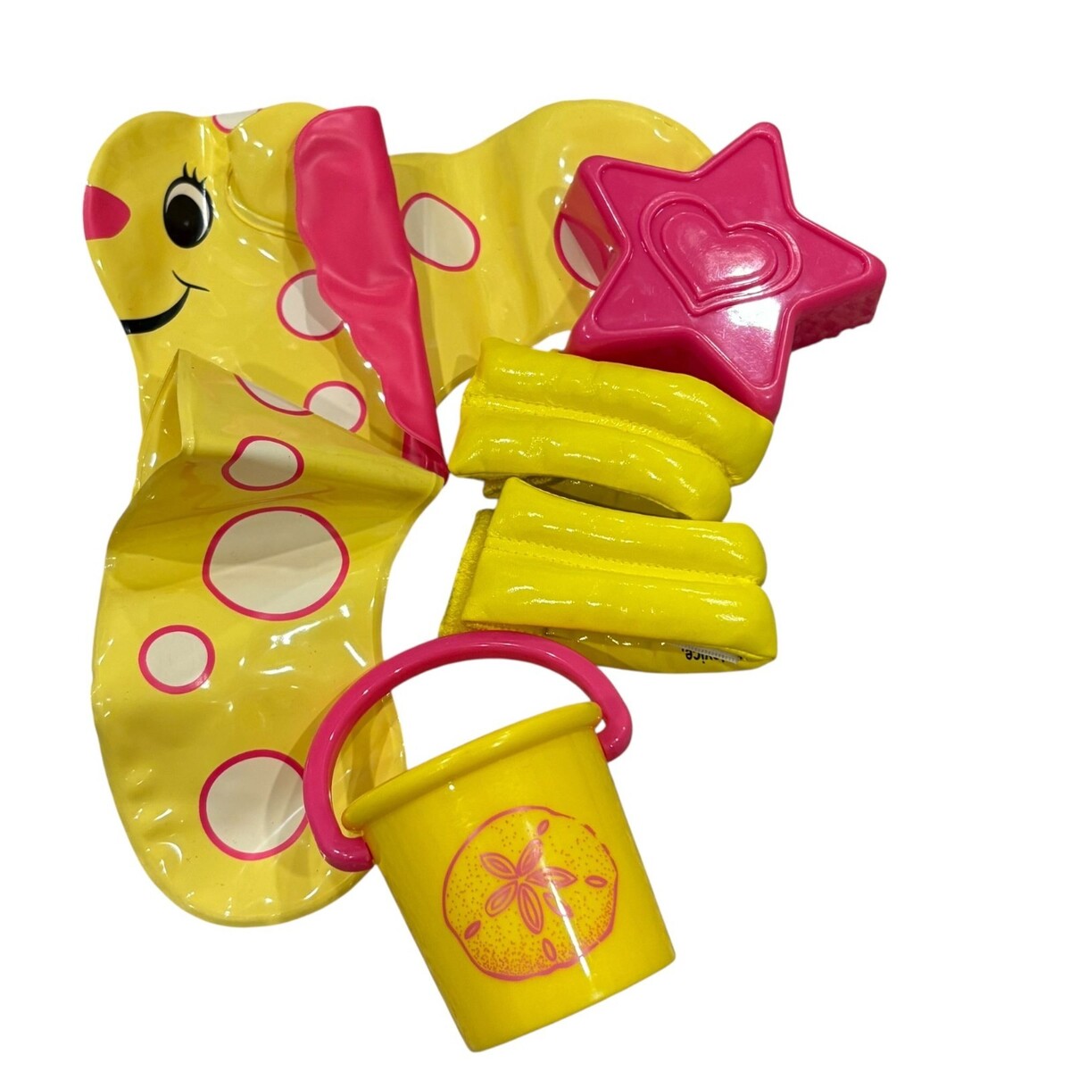 No visible flaws or damages. Floatie: 10 x 5 inches when flat; Bucket: 3 inches tall.