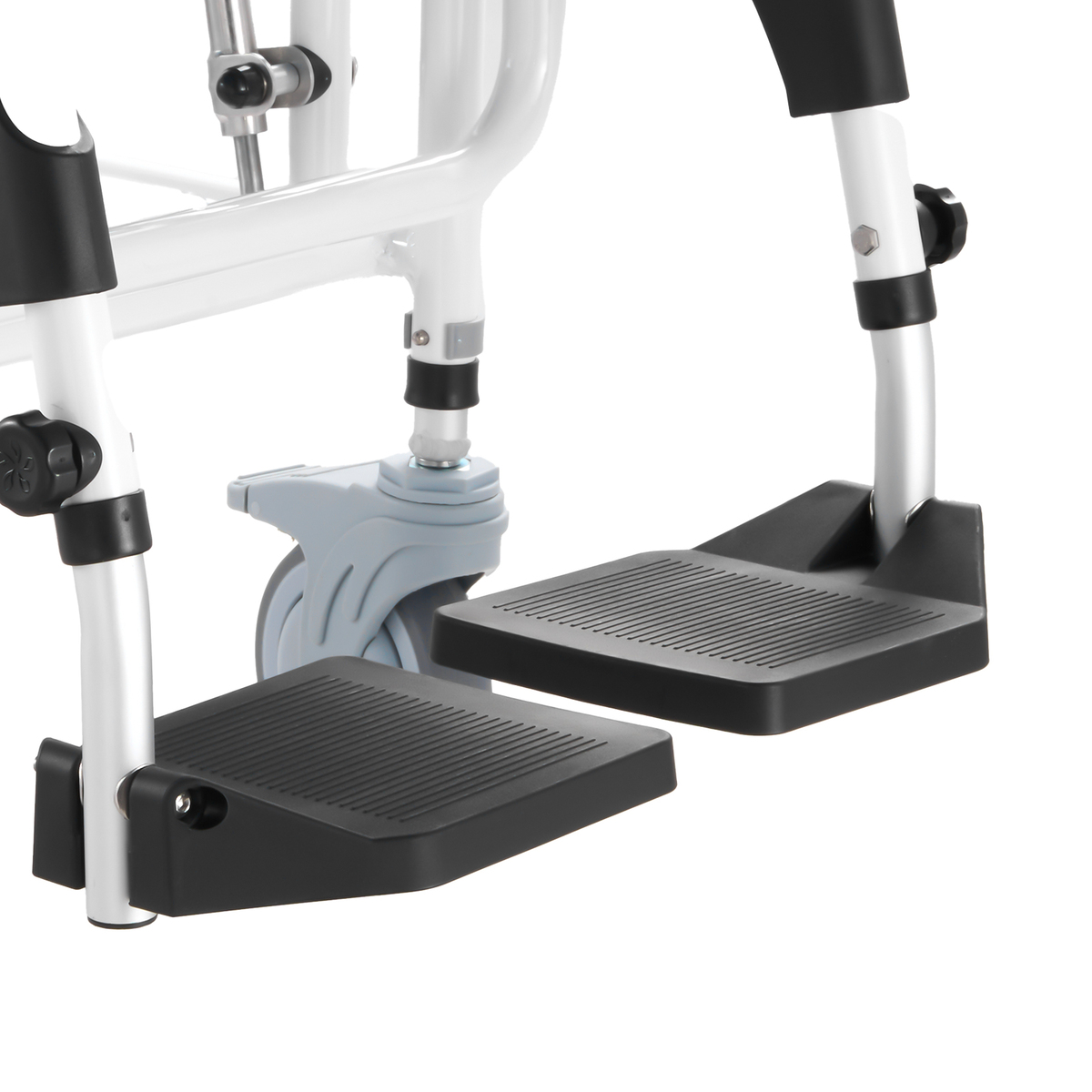 High Flexibility:The chair is detachable and foldable, allowing you to adjust it according to your needs. It comes with 5-inch braked casters to ensure safe movement. The unique pull-out commode, detachable flip-up footrest, and flip-up PU cushioned armrests provide both practicality and comfort.