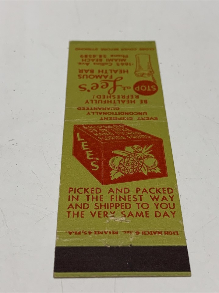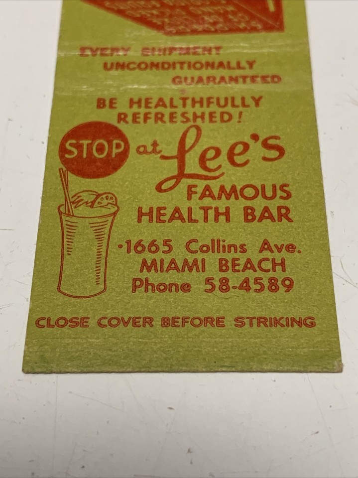 Rare Front Strike Matchbook Cover Lee’s Famous Health Bar Miami Beach FL. gmg