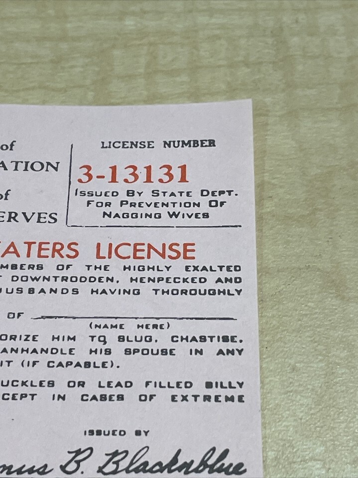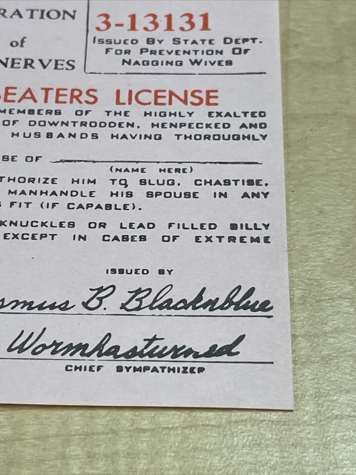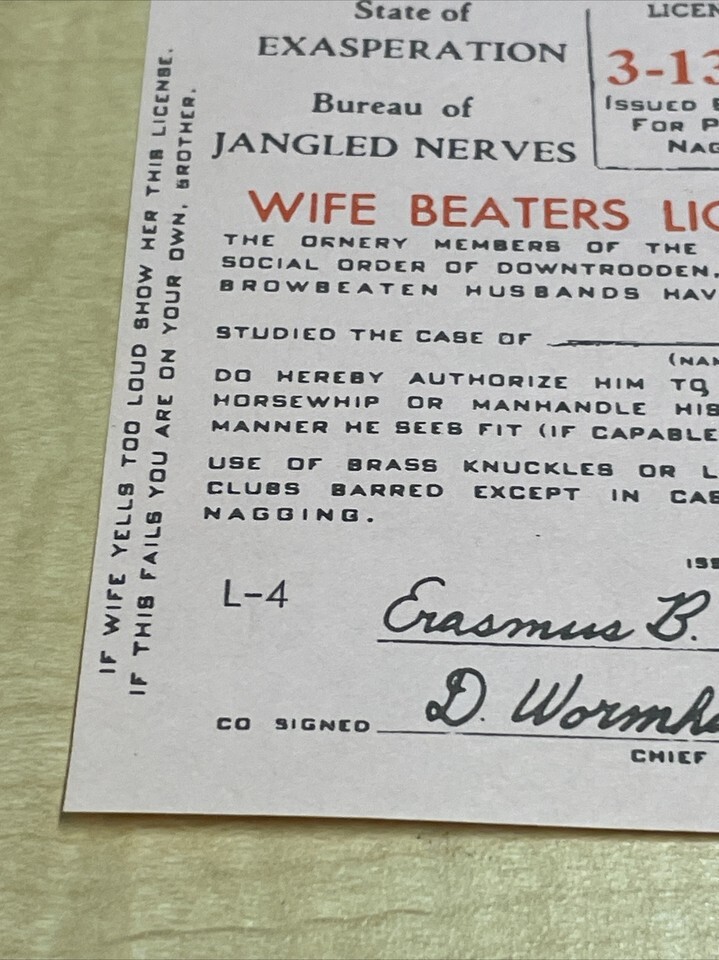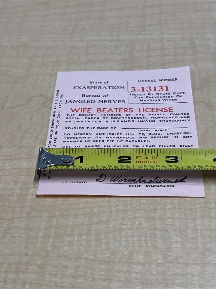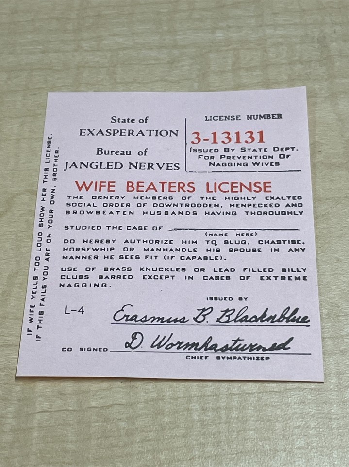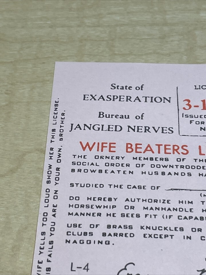 Vintage 1965 Pink Novelty Wife Beaters License Jokes Gags Pranks KG JD