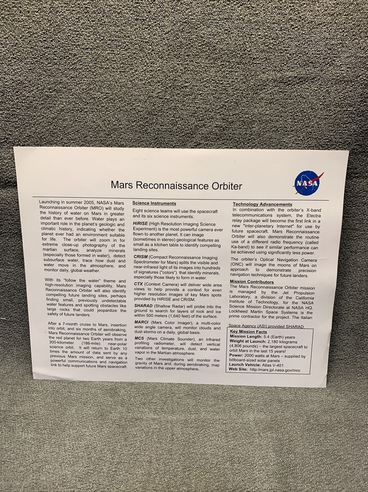NASA Engineer Owned 8x11 Photograph Fact Card Mars Reconnaisance Orbiter KG