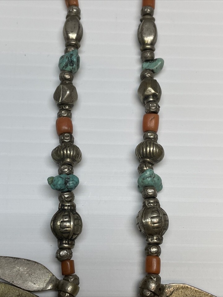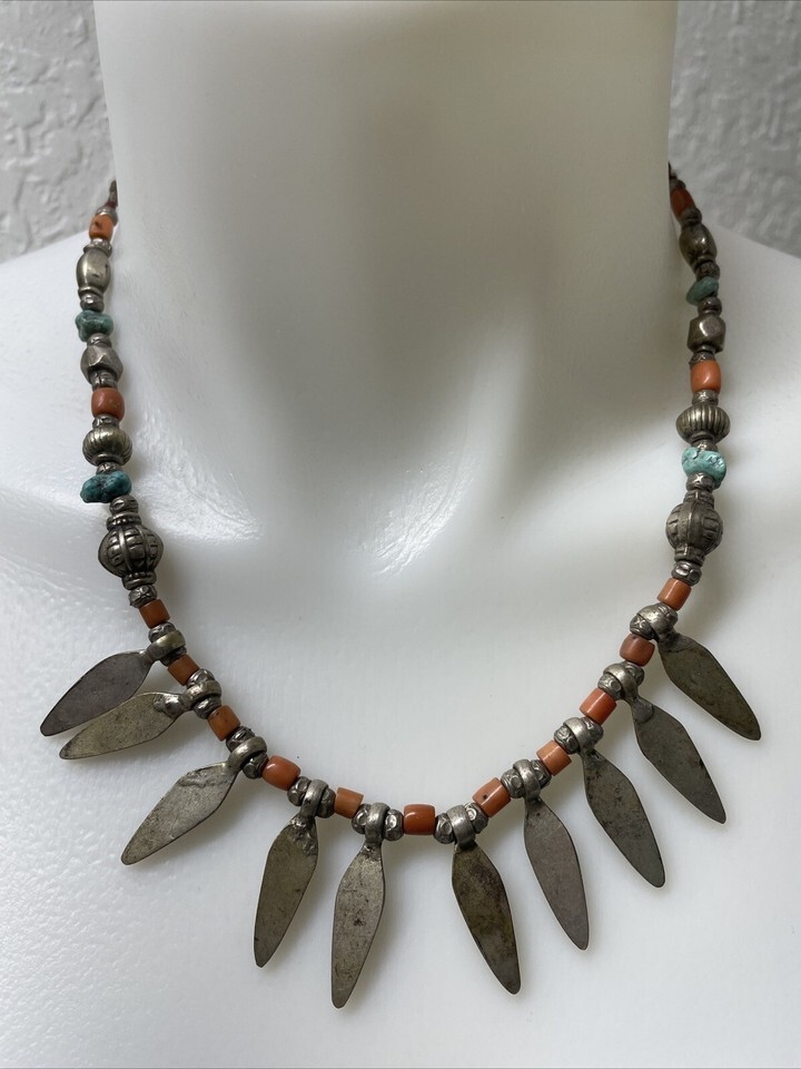 Vintage Tibetan Coral Turquoise Bead Silver Tone Spear Necklace Choker MH JD