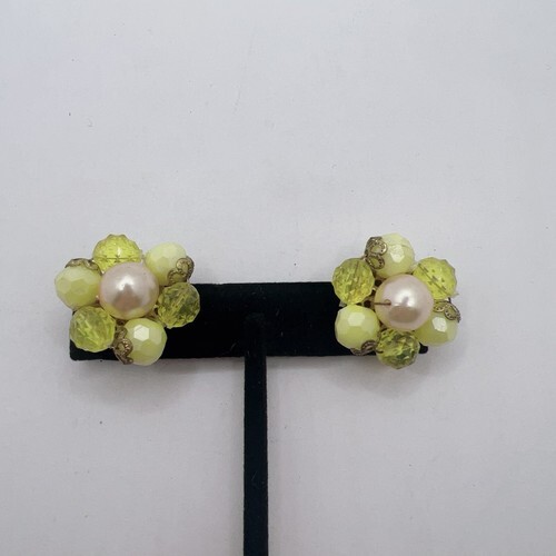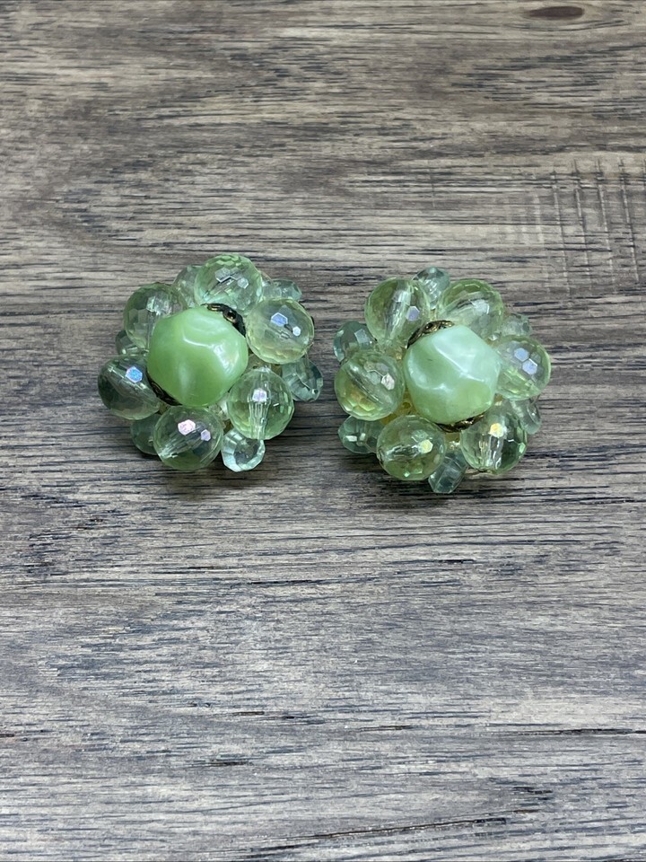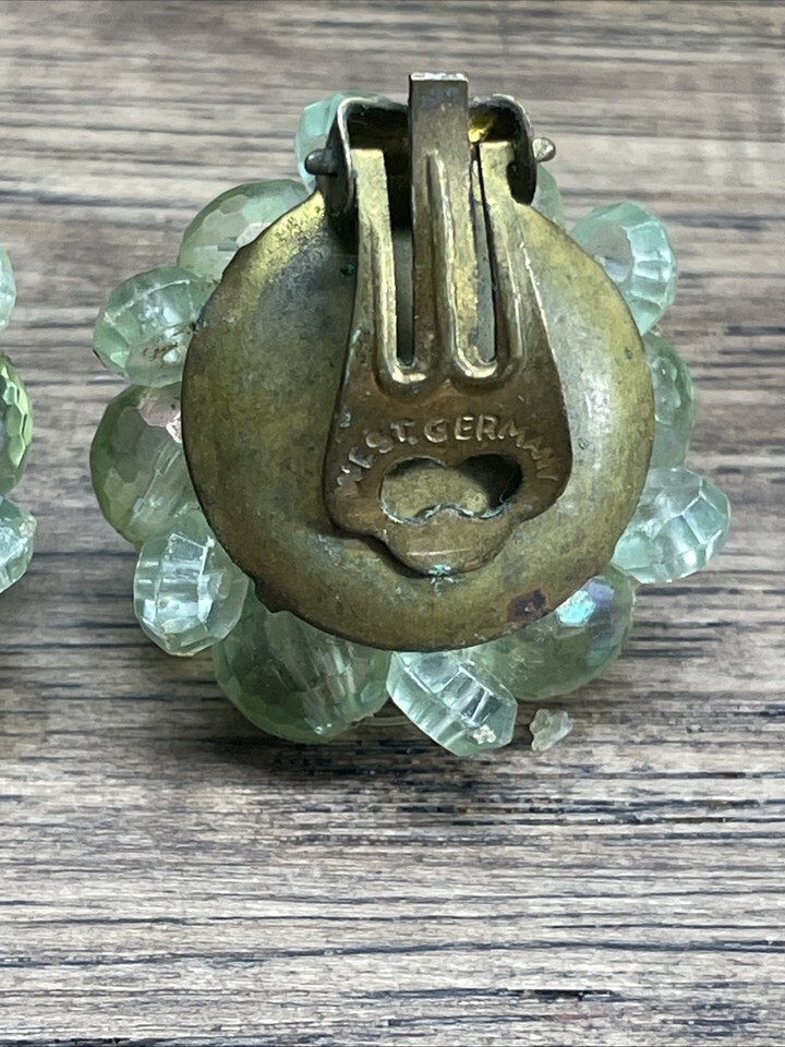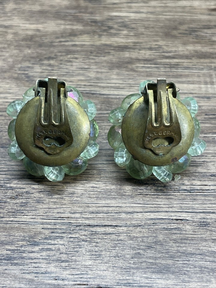 Vintage Green Beaded Cluster Clip On Earrings West Germany Estate Jewelry KG JD