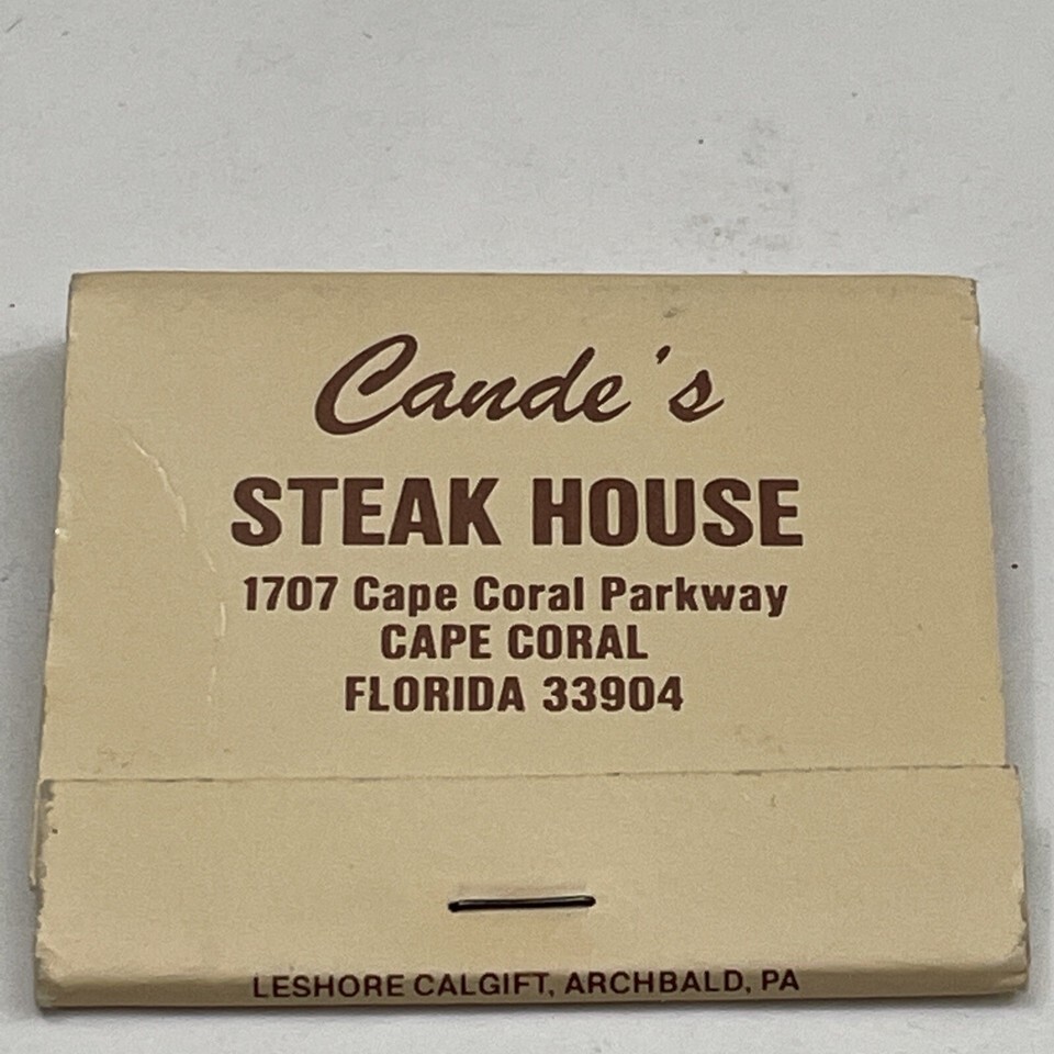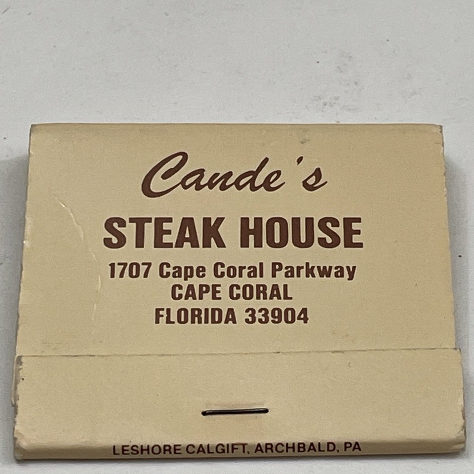Vintage Matchbook Cover Cande’s Steak House Restaurant Cape Coral, FL. gmg