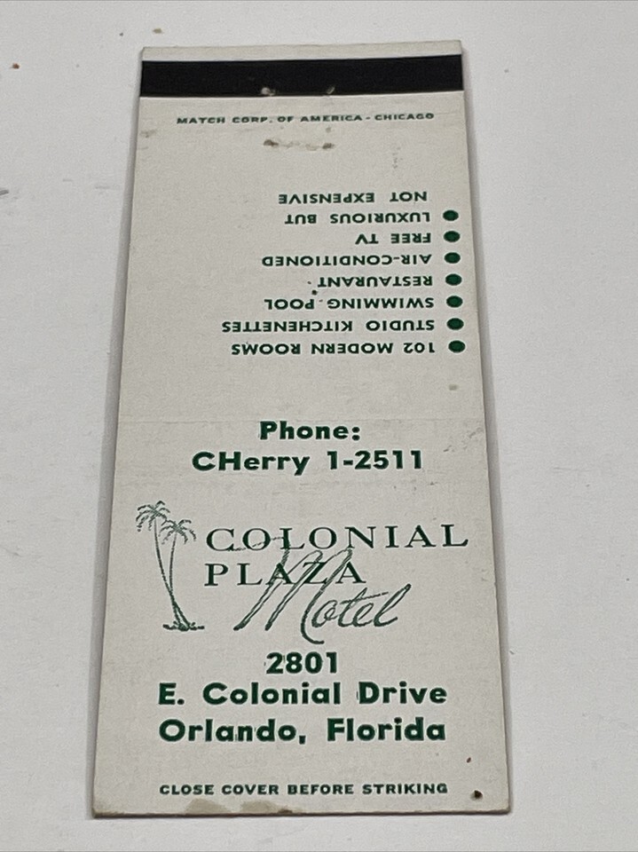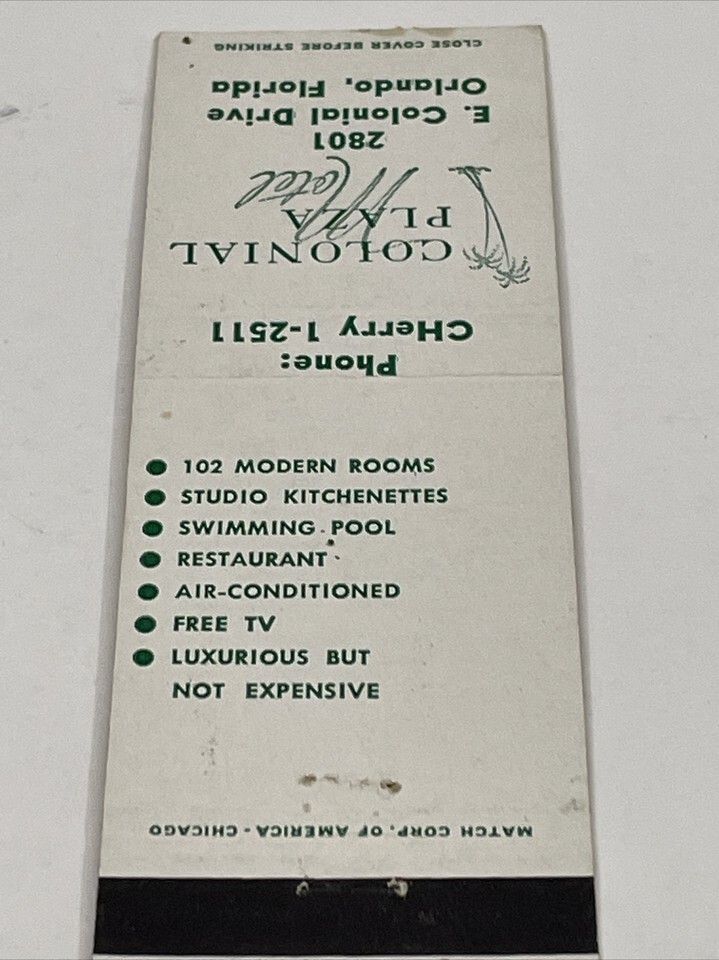 Front Strike Matchbook Cover Colonial Plaza Motel Orlando, FL gmg Unstruck