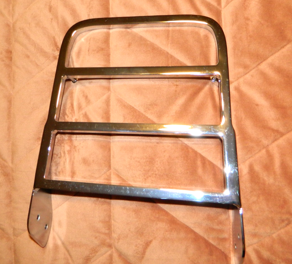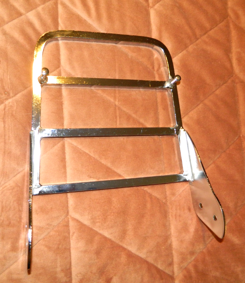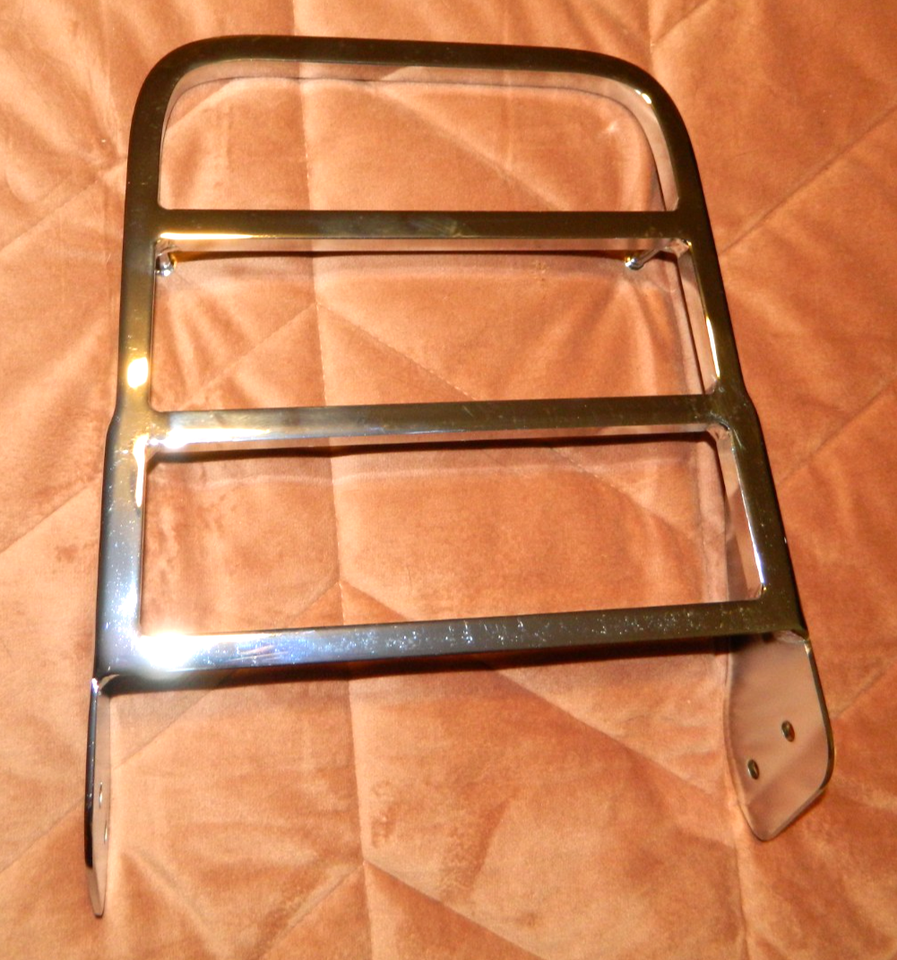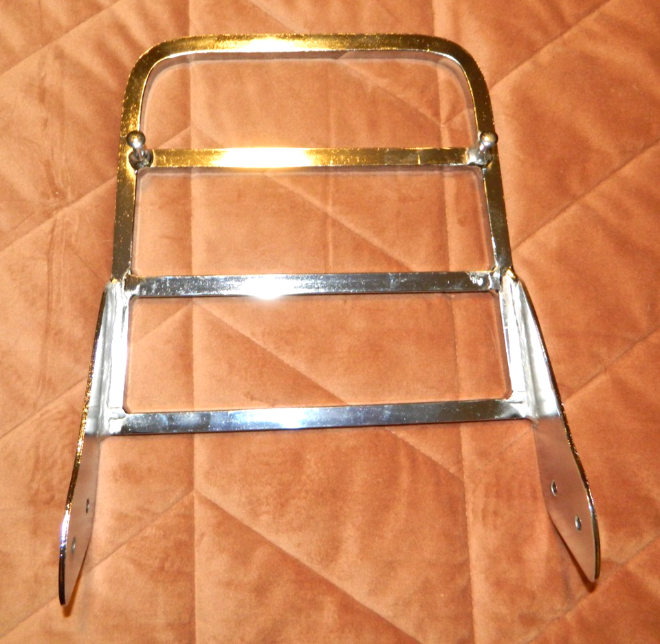 Listed is NEW Unbranded Chrome Motorcycle Luggage Rack and Sissy Bar. Measures 10 1/2" Long. 8 1/4" Front Width and 9 1/4" Rear Width. Has 2 Screw Holes each side of Flange Nice Chrome Finish and Very Sturdy. Empty weight is 3.4 pounds. Brand NEW and Never Used. Please email any questions. NOTE: No mounting hardware or screws included.