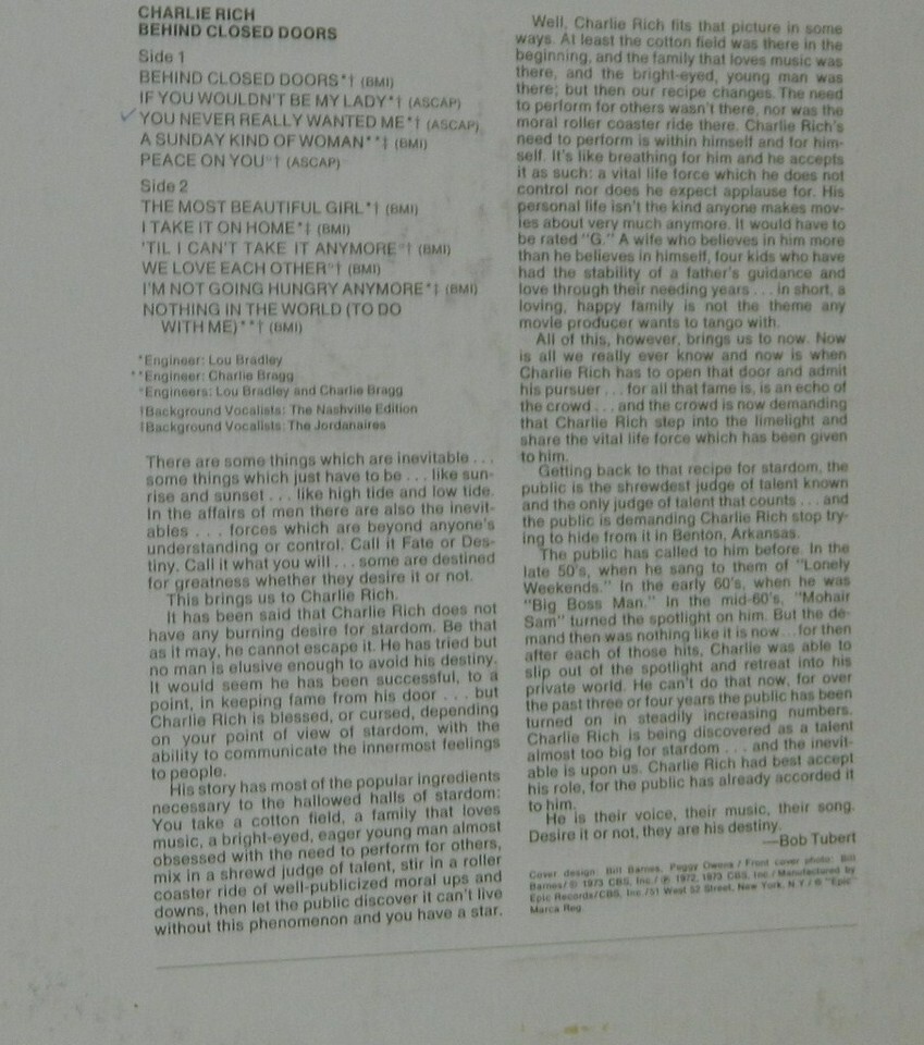 Listed is Charlie Rich "Behind Closed Doors" LP 1973 KE-32247 Viny / NM.