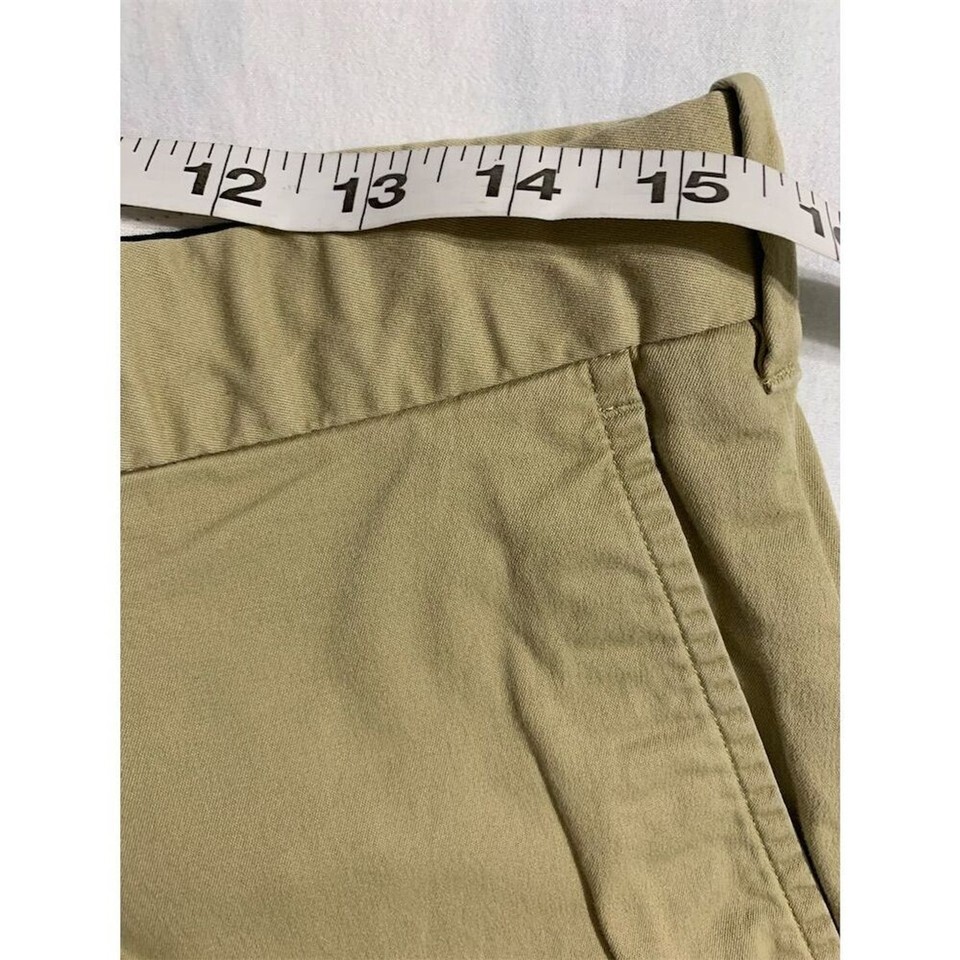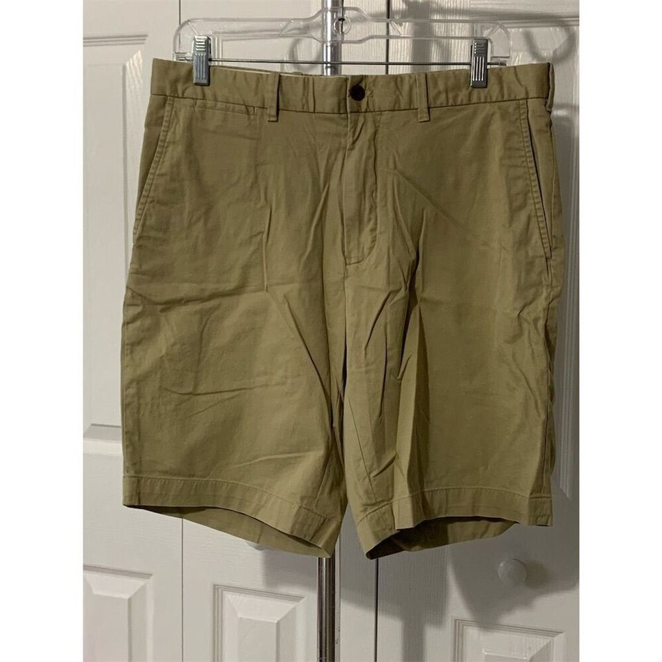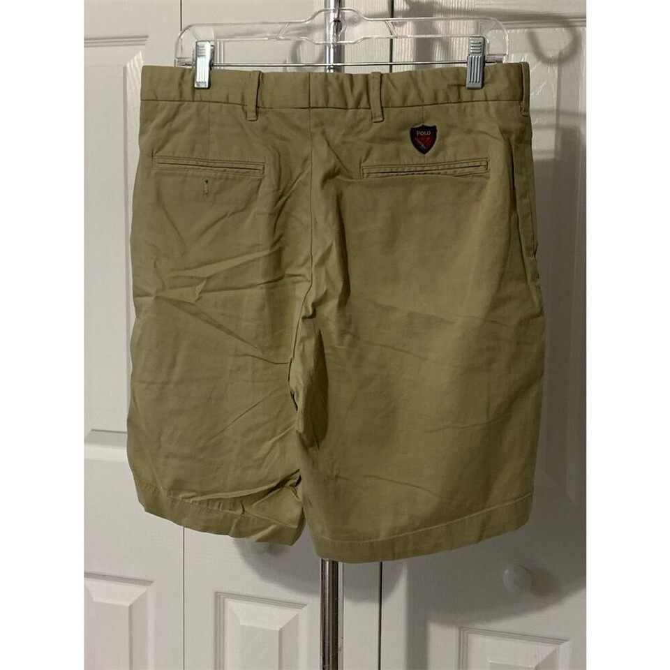 These Polo Ralph Lauren men's chino shorts are designed for casual summer wear. They are size 32 with a regular fit and feature a flat front, zip fly, and button closure. Made from a blend of cotton and elastane, the twill fabric is solid beige. The shorts include side and back pockets and an embroidered logo accent. The inseam measures 10 inches. This item is pre-owned.