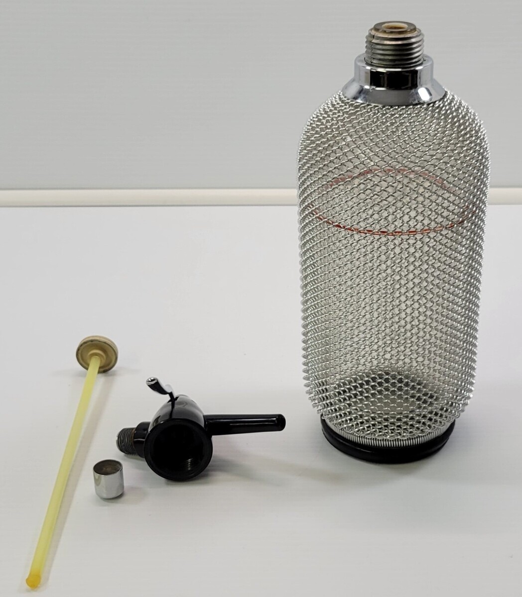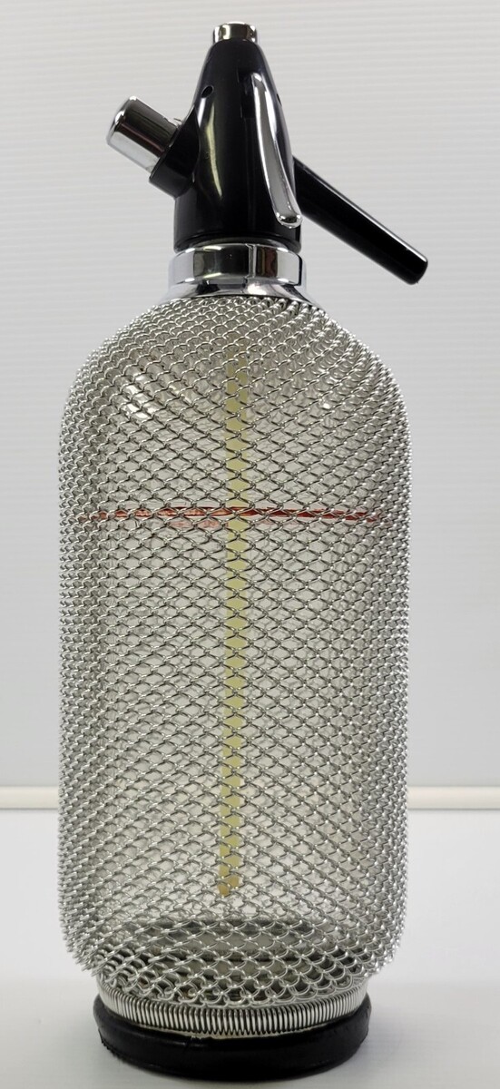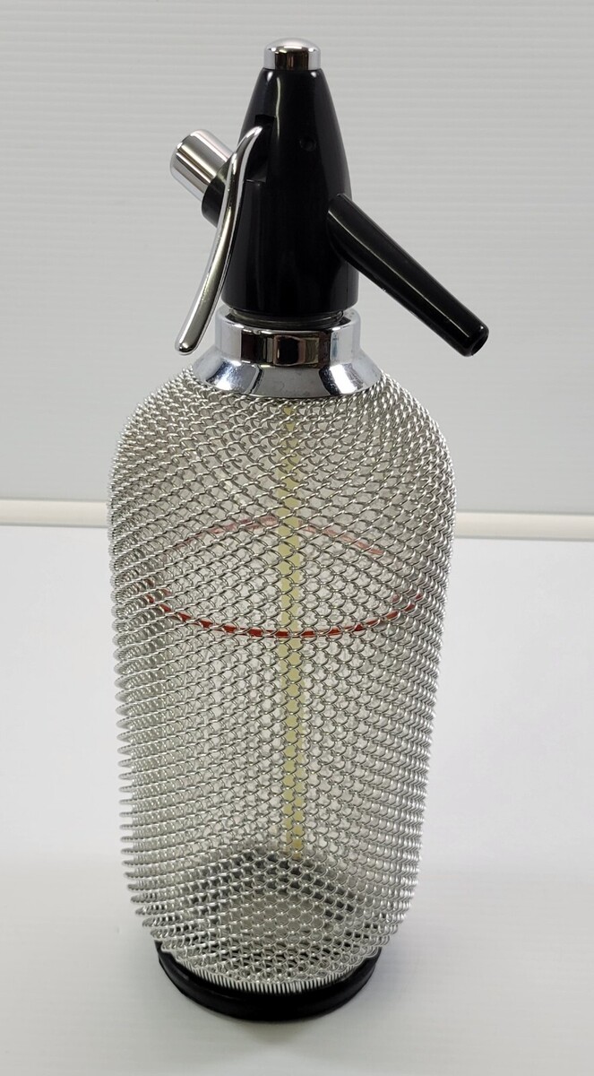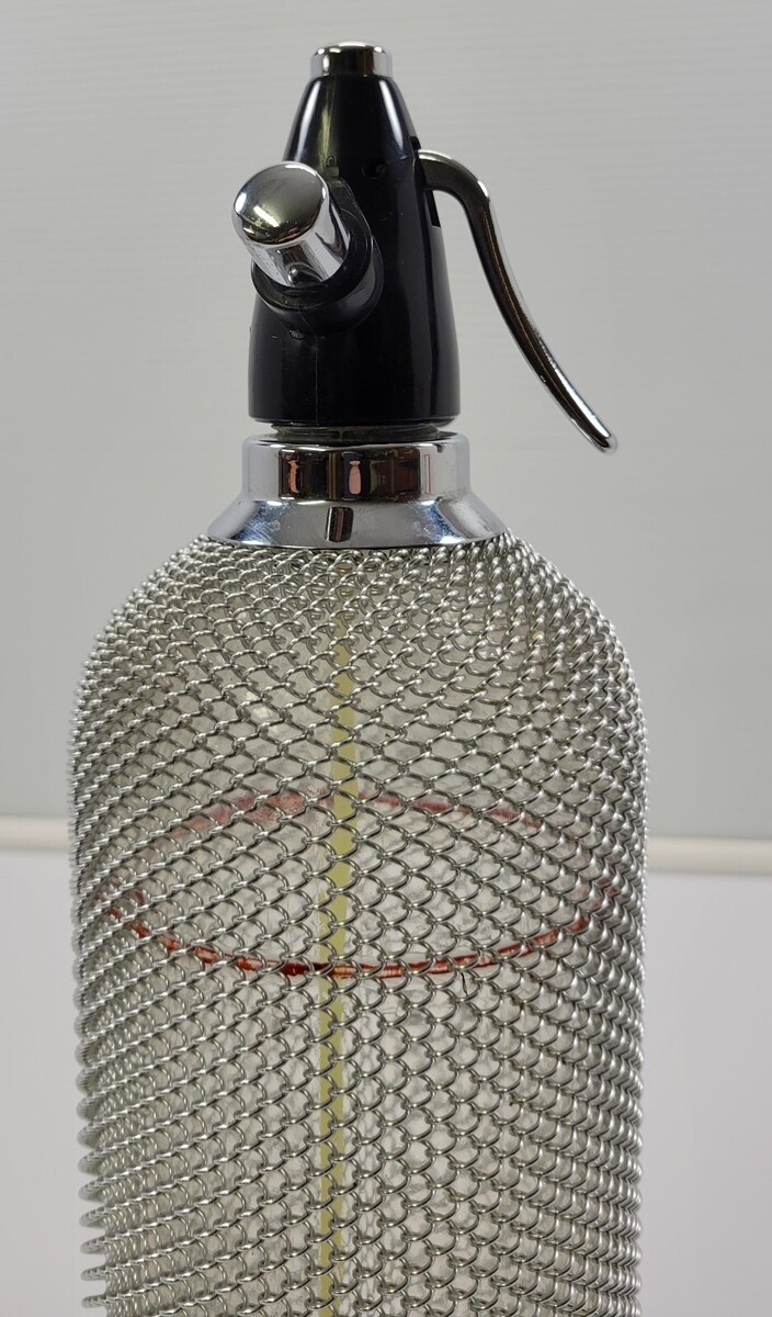 Vintage Seltzer Soda King Siphon Barware Chainmail Wire Mesh Glass Bottle