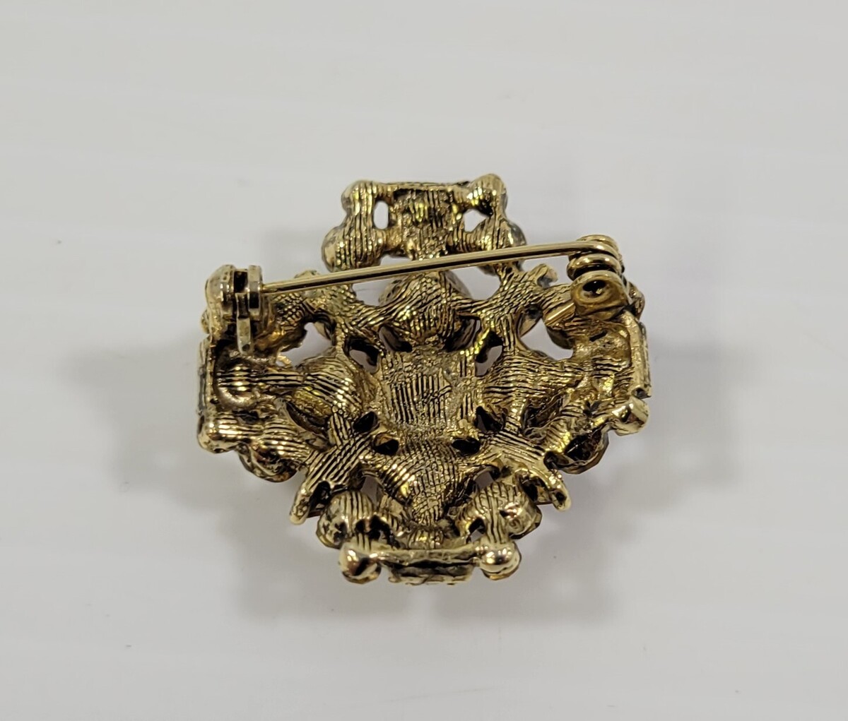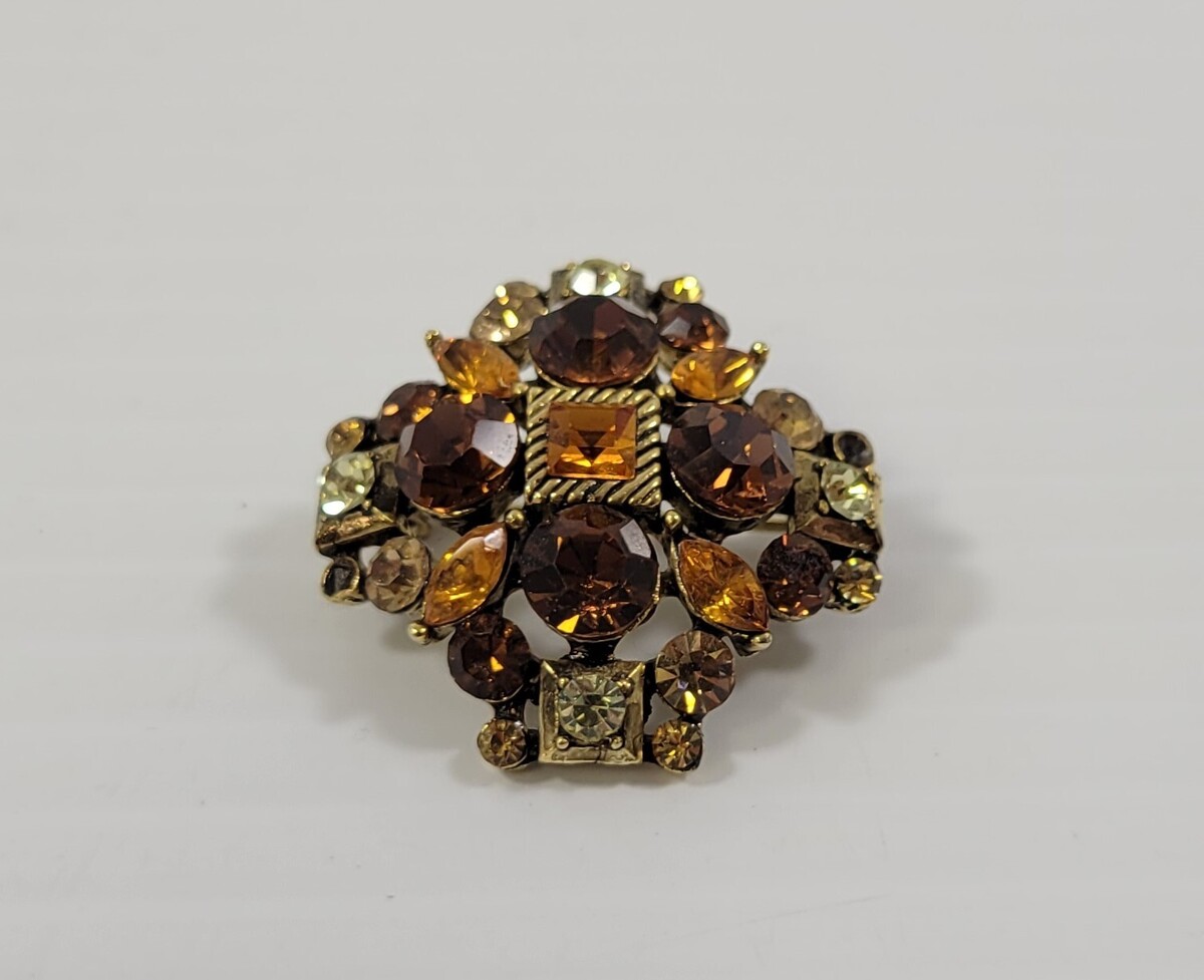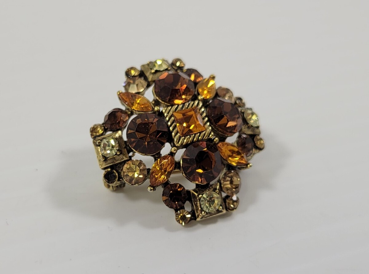 Vintage Gold Tone Amber Rhinestone Brooch Pin