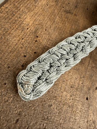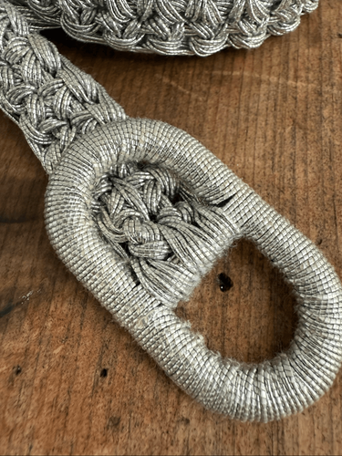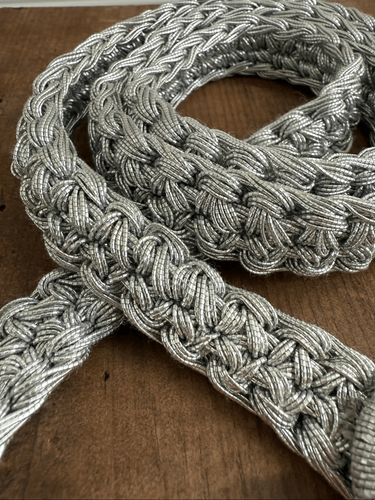 Unbranded vintage woven or braided belts made of metallic silver threads. Fully adjustable with a slip buckle measuring 40 inches end to end. One of the pictures shows how it would fit on a size small dress form. Medium and large would have less of a tail. No noted flaws. 3/4 of an inch thick with a buckle measuring 2.5 inches wide and 1.25 inches tall