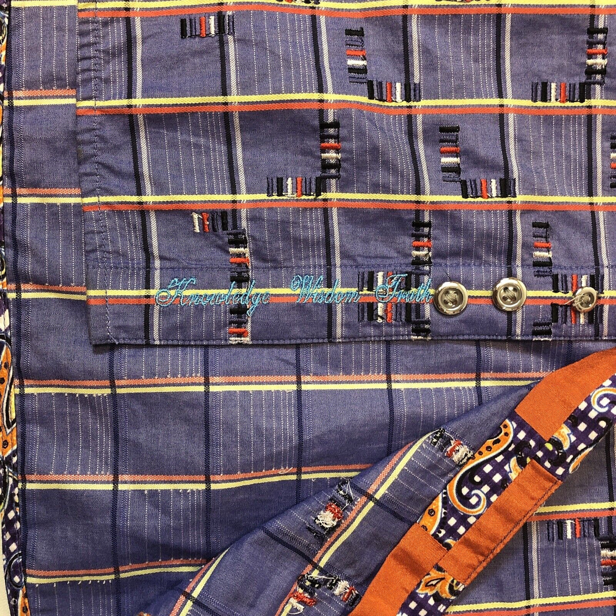 A multicolored, multi-lined box grid patterns a contemporary sport shirt accented with embroidered bars, a smart spread collar and script-scrawled contrast lining. Rounded, two-button cuffs.