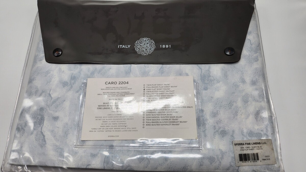 Sferra Caro Dusty Blue King Flat Sheet Abstract Egyptian Sateen Print Italy NEW