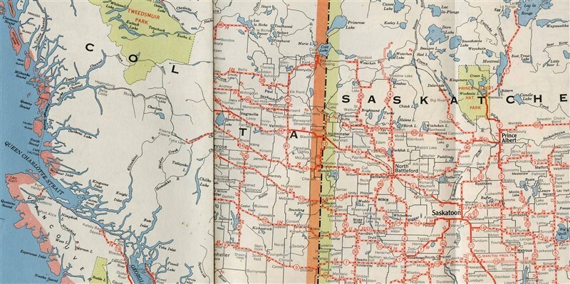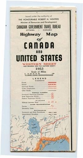 A Highway Map of Canada and United States. Published by the Canadian Government Travel Bureau in 1953. In fine condition no flaws. with the Eastern Sheet on one side and the Western Sheet on the other side.