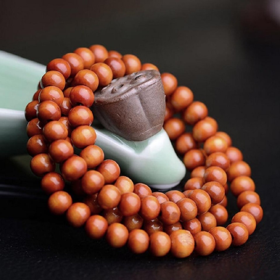 This mala is made of 108 wood beads and is strung with durable elastic cord.