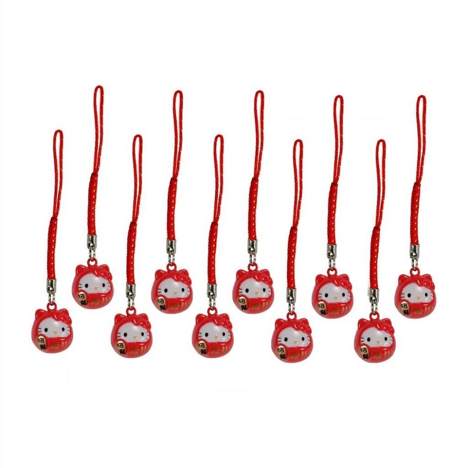 10 HELLO KITTY BRASS BELL CHARM Lucky Fortune Daruma Red Cell Phone Strap Set