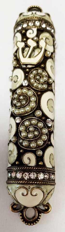 NEW JUUDAICA JEWELED MEZUZAH DARK WHITE PEARLS CHRYSTALS 4"