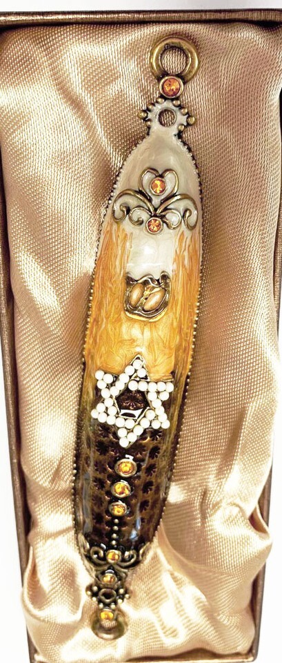 with dark brown, yellow and cream and embellished with Jewish star and yellow crystals and gold accents. The perfect gift for someone who has just purchased