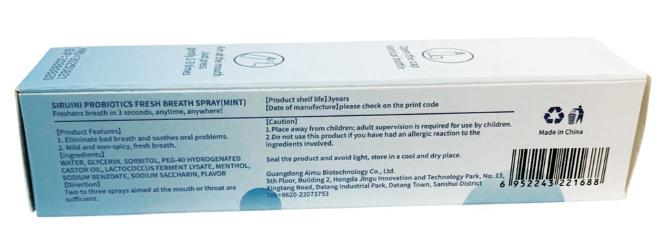 SIRUINI PROBIOTICS FRESH BREATH MINT MOUTH SPRAY ORAL HEALTH FORMULA 20ml/0.7oz