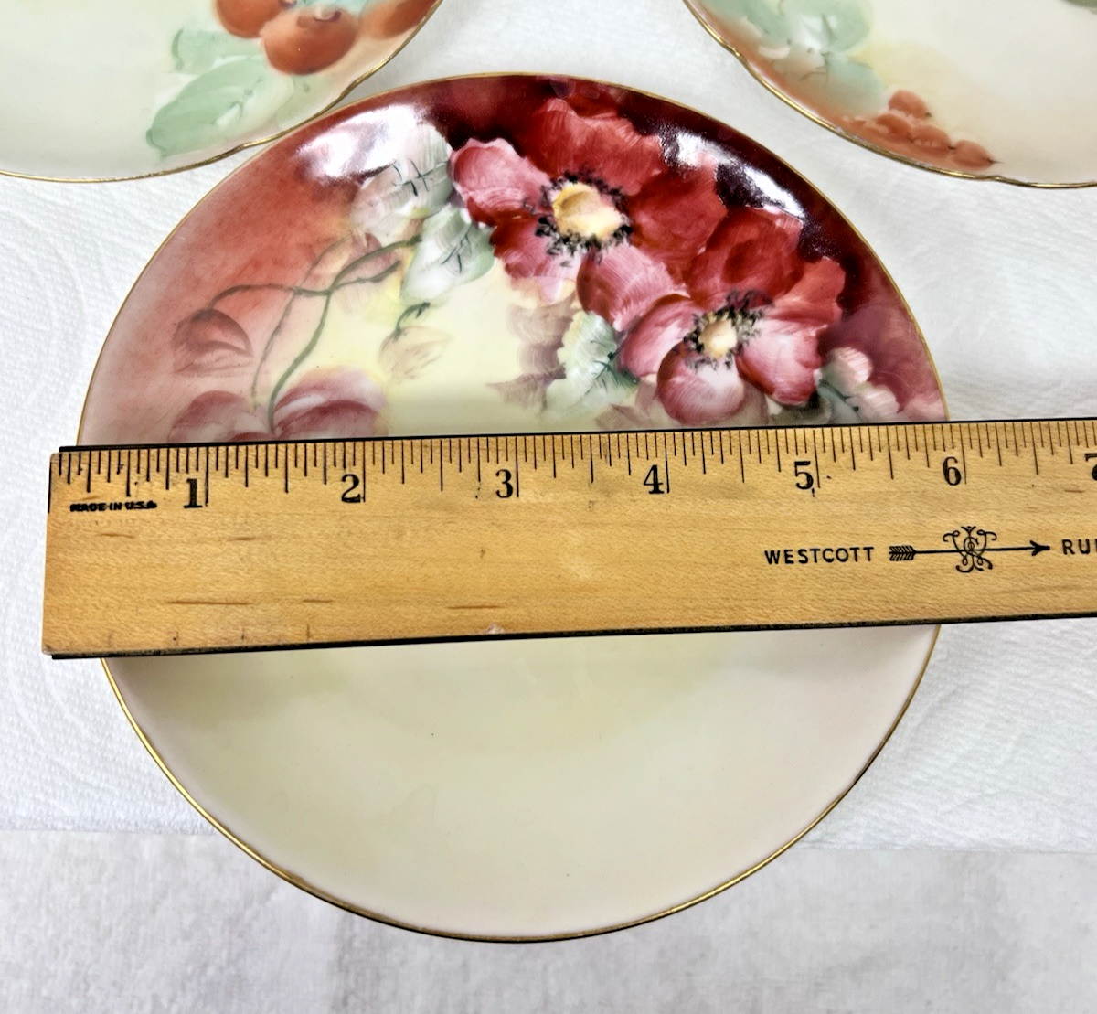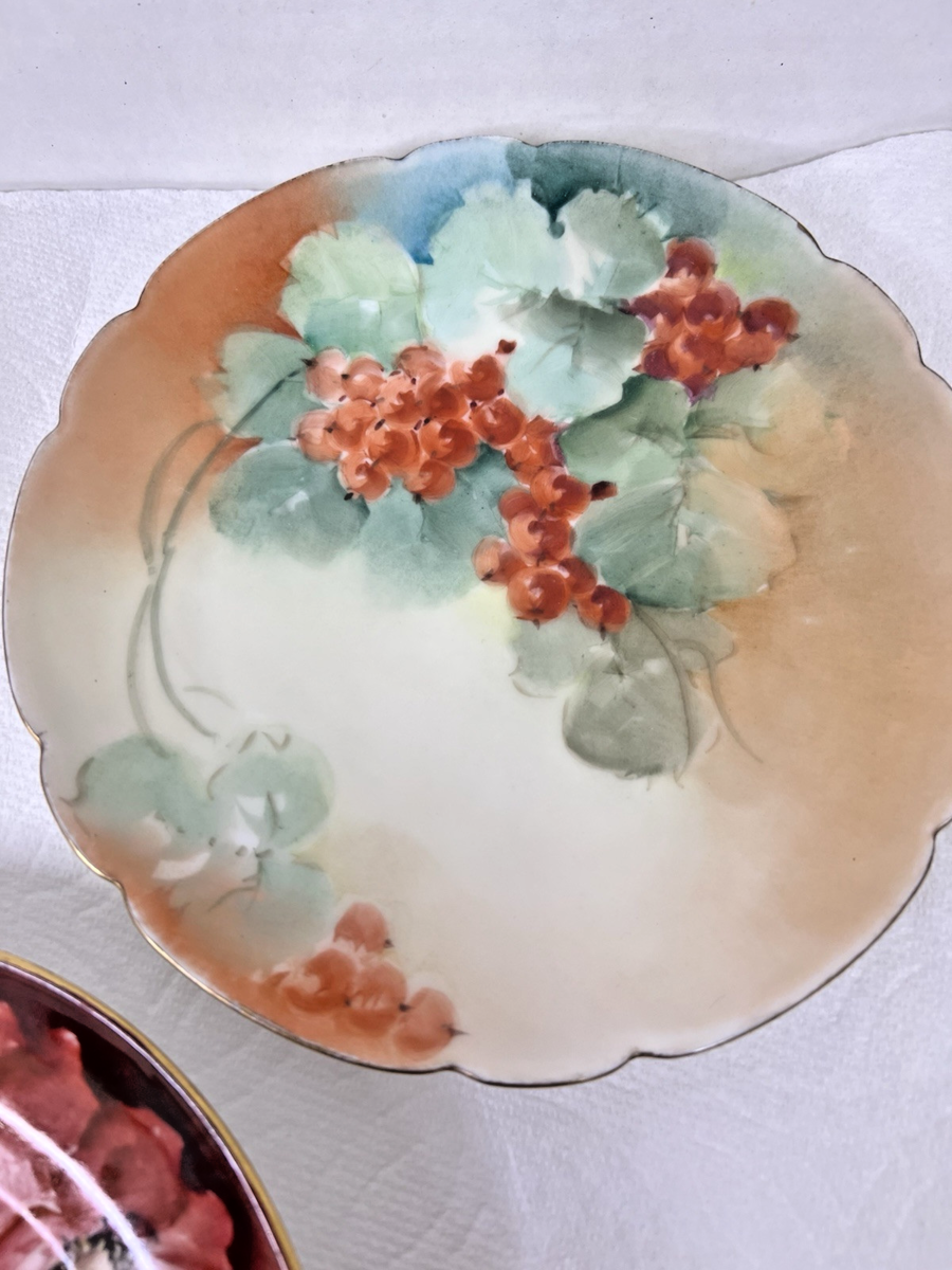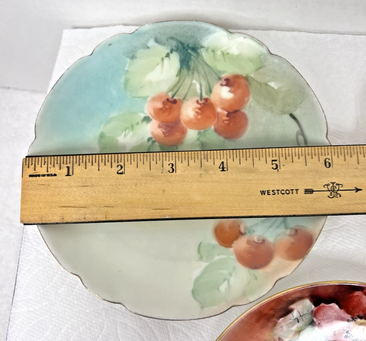 3 Hand Painted Fruits Floral Plates Cherries Currents Pink Floral Haviland Plus No chips or cracks we think they were hung on a wall as no silverware marks all about 6 inches across the 2 scalloped rim ones are Haviland and the smooth edge is Rosenthal