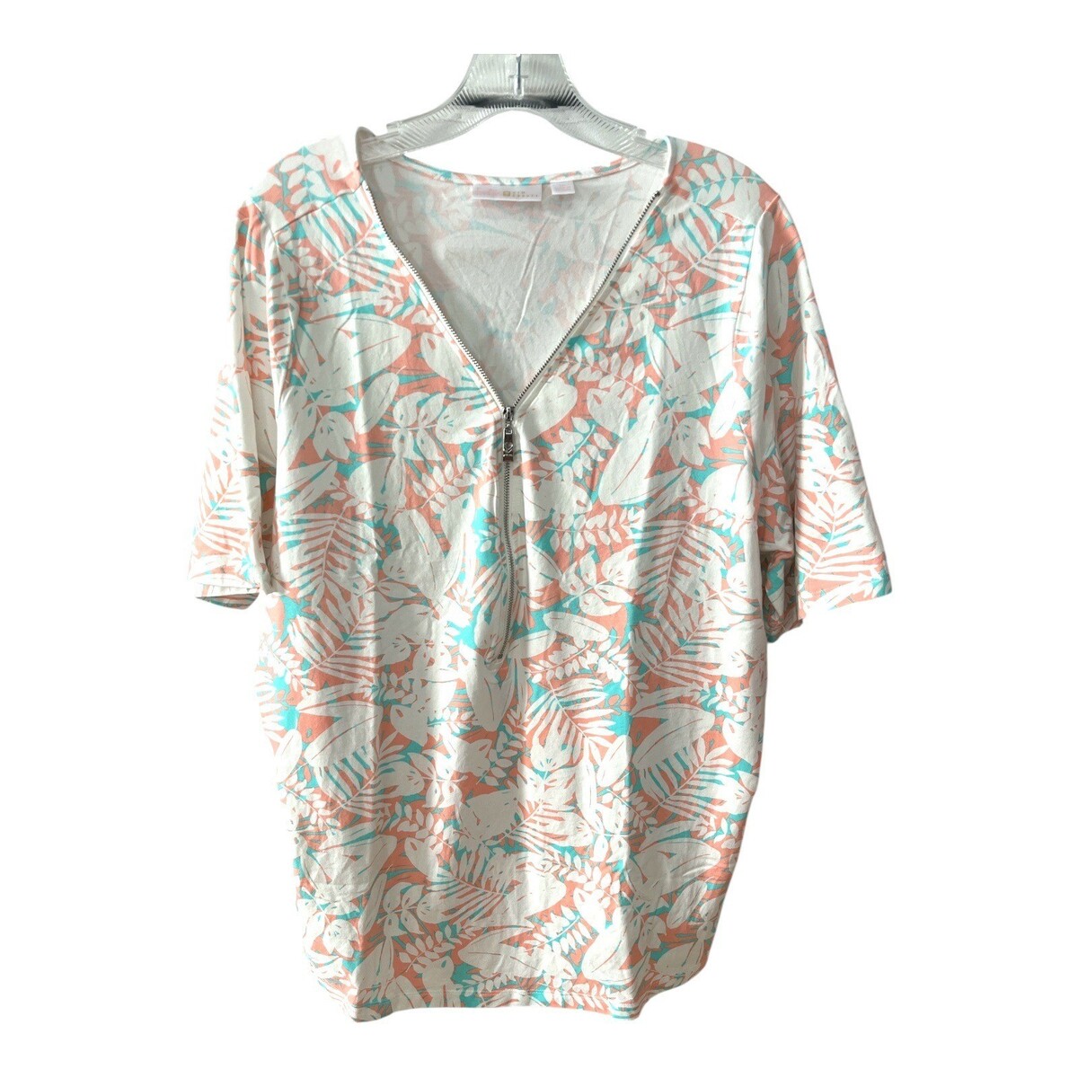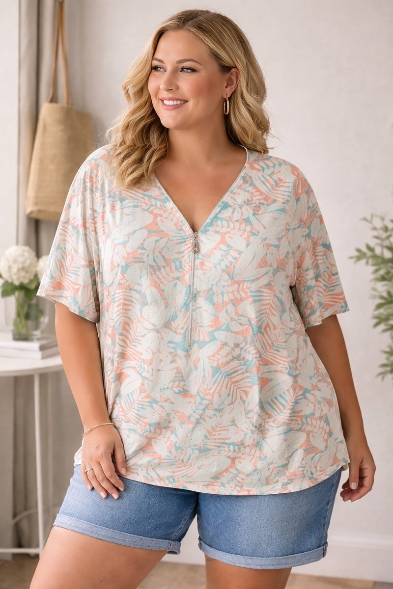 Women?s short sleeve tropical print top by Kim Gravel from the Belle collection. Features a soft pastel leaf pattern in coral and aqua on a light background, a V-neckline with functional zip front, and relaxed drape. Finished with a decorative zipper pull detail that adds a subtle statement touch. Comfortable and flattering for casual wear or vacation styling.