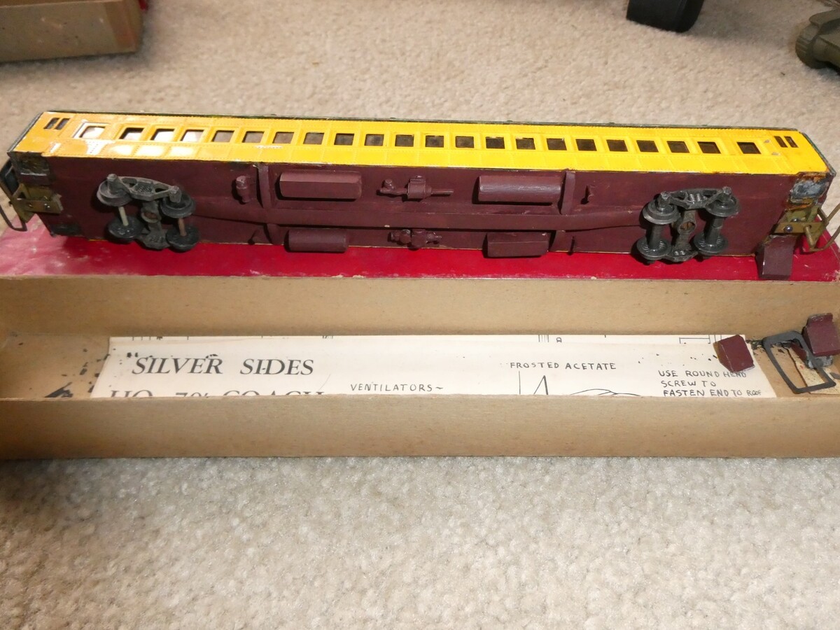 You are bidding on a 1950s era HO scale JC Models silver sides, custom painted green and yellow passenger car, in open box in the pictures. 10.75 inches long. Built in box, light wear, lower steps need to be glued, paint wear and loss as shown, maybe could use some fine cleaning. Box has general wear. Sold as shown. Zoom in for details.