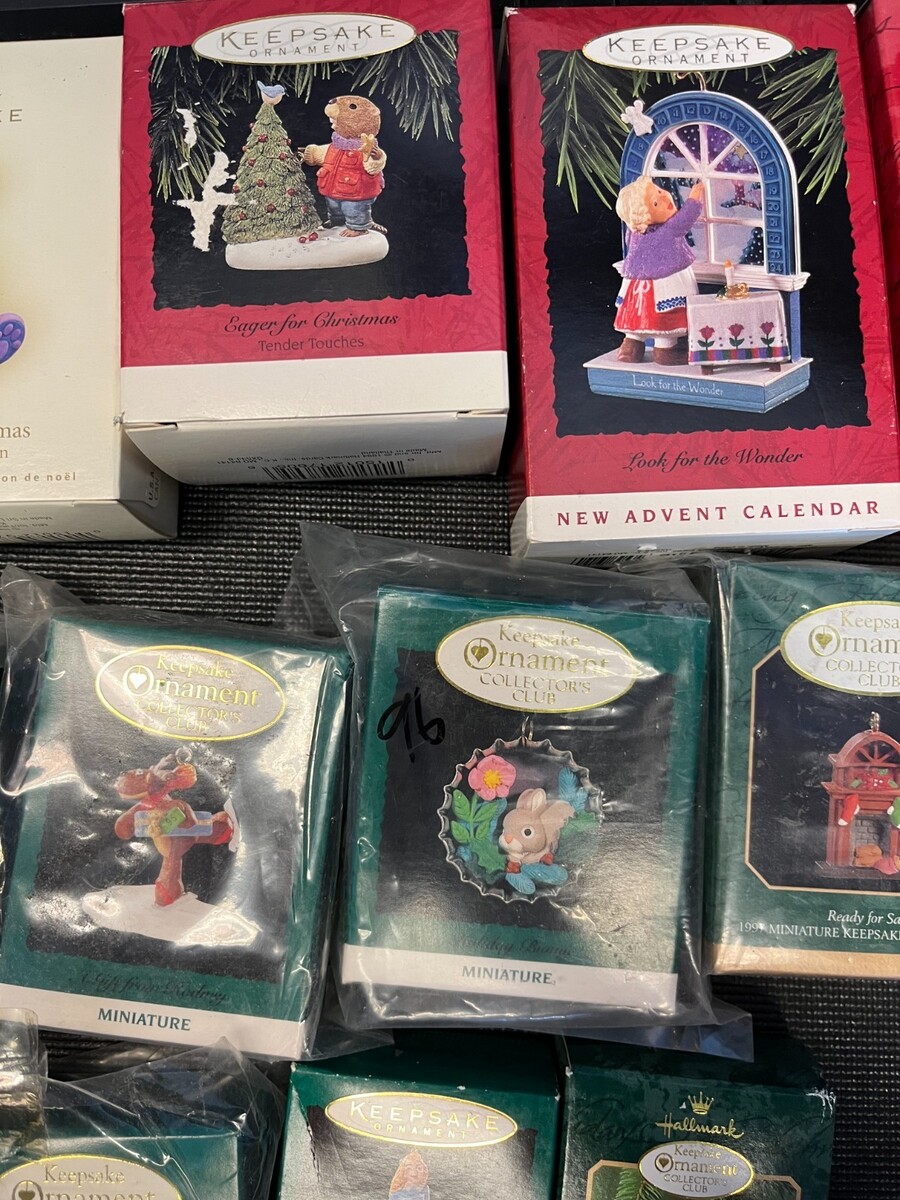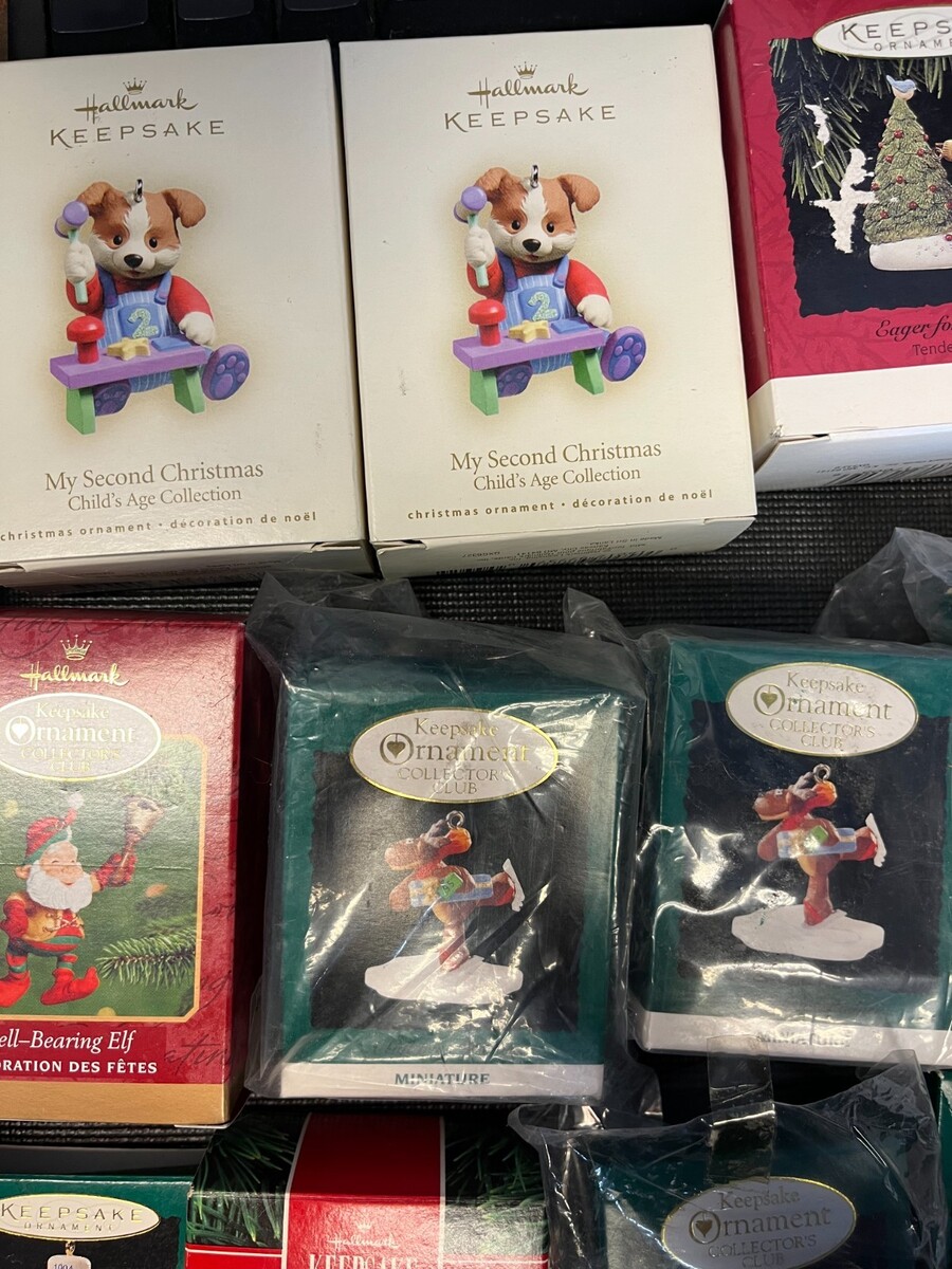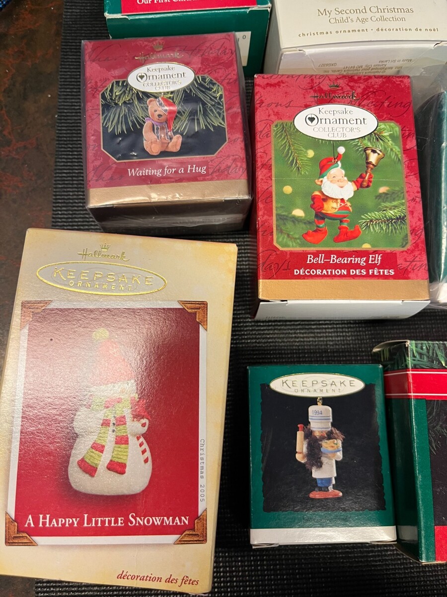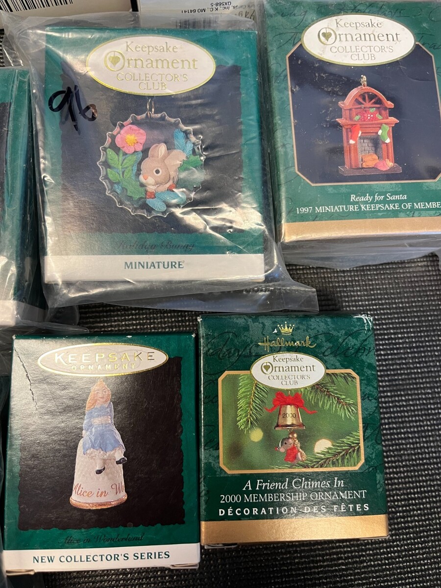 Lot of vintage Hallmark Keepsake ornaments from 1990?2005, heavily focused on Collector?s Club membership pieces like A Friend Chimes In (2000), Waiting for a Hug (1999), A Gift from Rodney (1995, two copies), Rudolph?s Helper (1996), Holiday Bunny (1994), Ready for Santa (1997), Ringing Reindeer (2000), and Bell?Bearing Elf (2000). Also includes popular series and themes such as Nutcracker Guild (1994), Under the Mistletoe (1991), A Happy Little Snowman (2005), Artist?s Favorites ?On Her Toes? (1993), Alice in Wonderland (1995), Eager For Christmas (1994), Look for Wonder (1993), two ?My Second Christmas? child?s age ornaments, and ?Our First Christmas Together? dated 1990. Note clearly that some are new in box and others are open?box