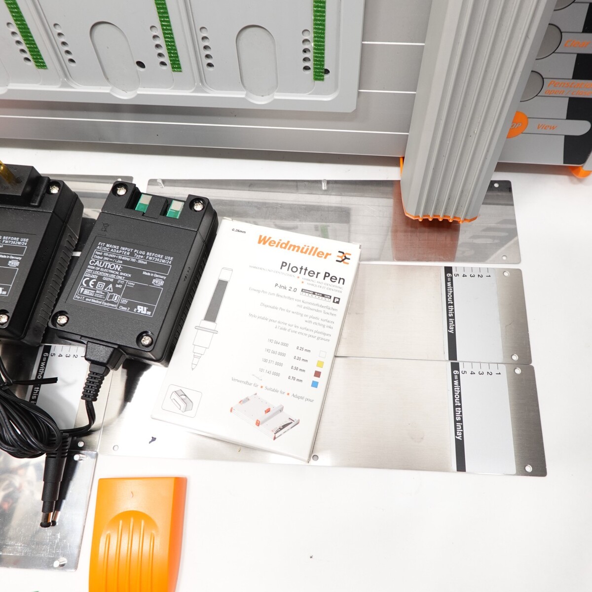 Up for sale is a Weidmüller MCP Plus industrial plotter/printer system, complete with power supplies, software, and accessories. This system has been tested and is in good working condition. Ideal for industrial labeling and panel marking applications.