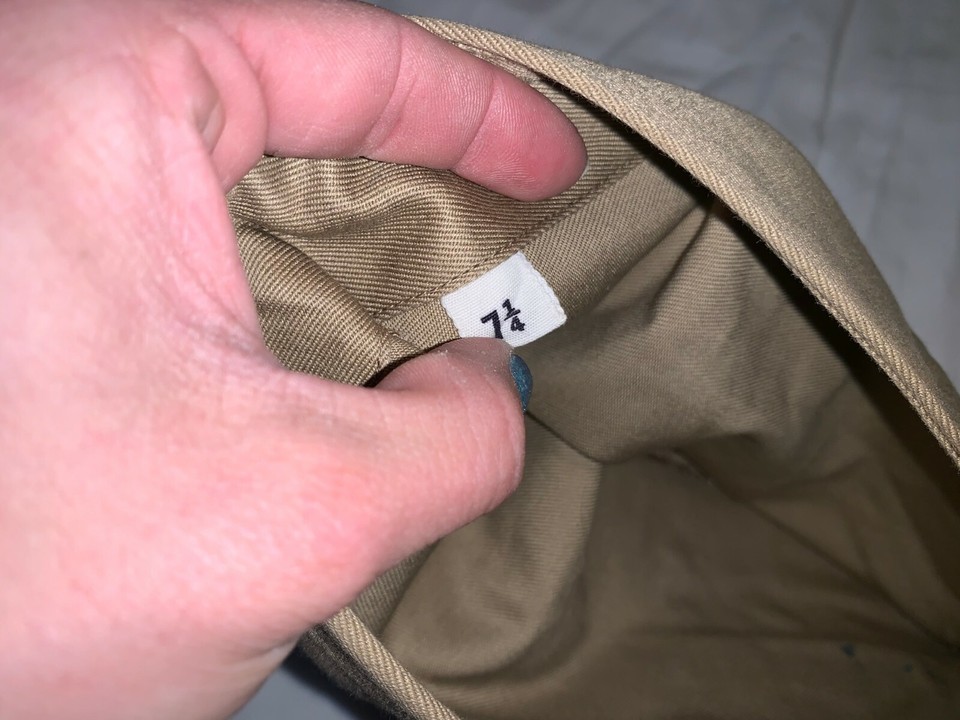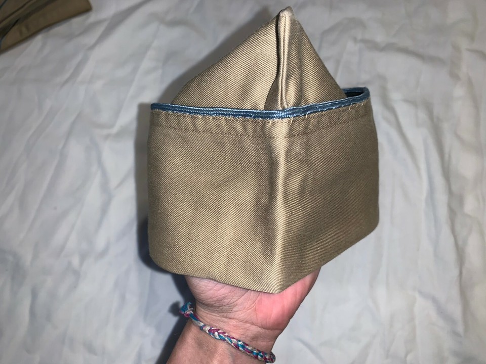MATERIAL IS SLIGHTLY DARKER THAN THE NORMAL M-1950 KHAKI GARRISON CAP BUT NOT MAJOR DEFECTS