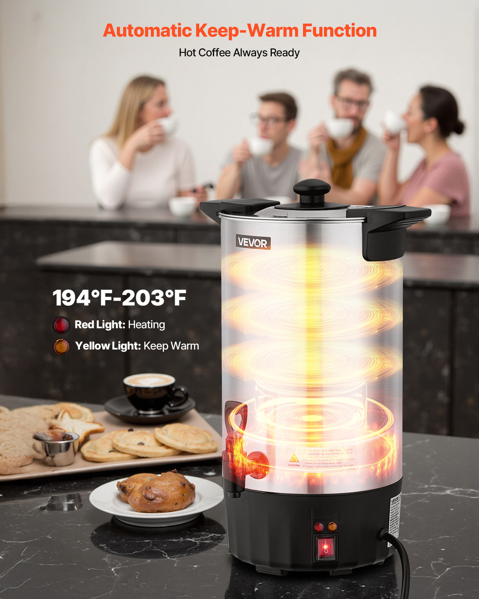 Long-Lasting Heat Preservation: This large coffee urn maintains 194?-203? / 90-95? with plug-in heating. Red and yellow lights show heating and keep-warm status, locking in the coffee aroma so you always enjoy steaming cups for continuous service