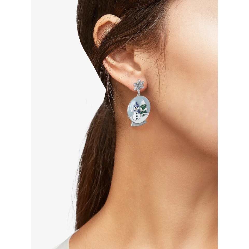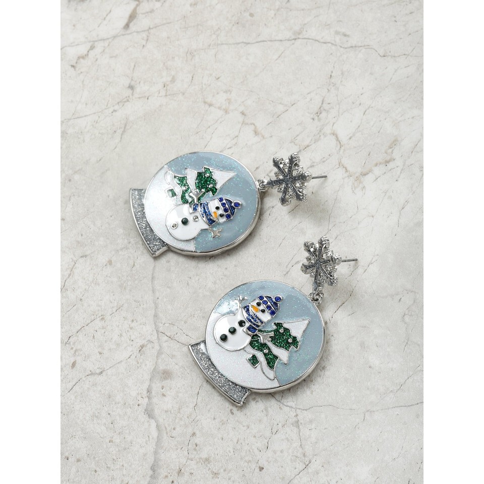 These enchanting snow globe earrings capture the magic of winter in a stylish design. Each earring features a miniature winter scene with a cheerful snowman inside a shimmering globe, creating a festive and cozy aesthetic. A delicate silver snowflake stud adds a frosty charm, enhancing the winter wonderland appeal. These earrings are a perfect holiday accessory, bringing a whimsical and festive touch to any seasonal outfit.