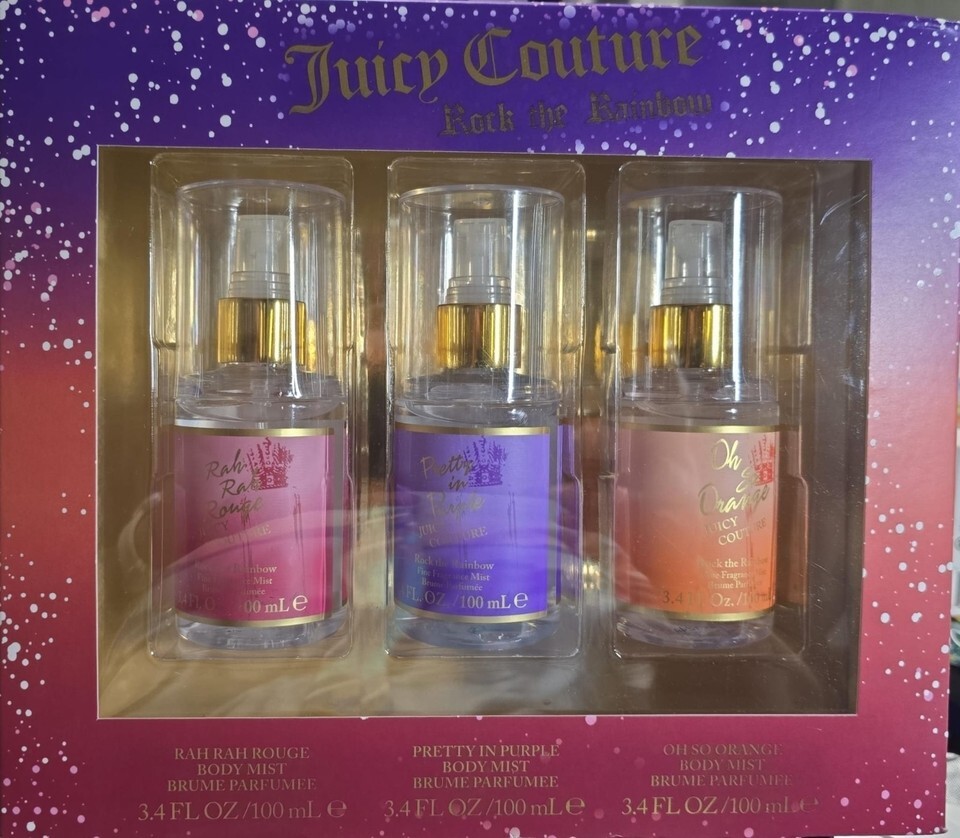 The Juicy Couture Girl lives life in vivid color, defying the rules and twisting the trends. She follows her own brilliant path to the end of the rainbow, as she stirs up an irresistible new fragrance vision. Enjoy this set of 3 colorful and exciting fragrances designed to match your mood with Rock The Rainbow by Juicy Couture. This Juicy Couture Rock the Rainbow Gift set includes: 3.4oz Rah Rah Rouge Body Mist, 3.4oz Pretty In Purple Body Mist, 3.4oz Oh So Orange Body Mist
