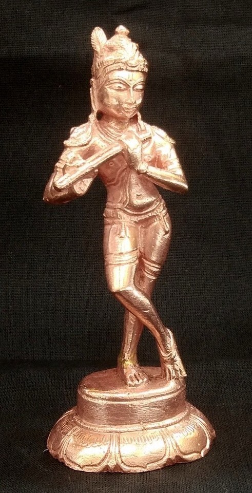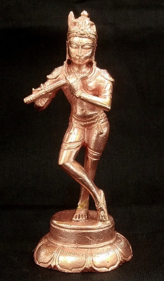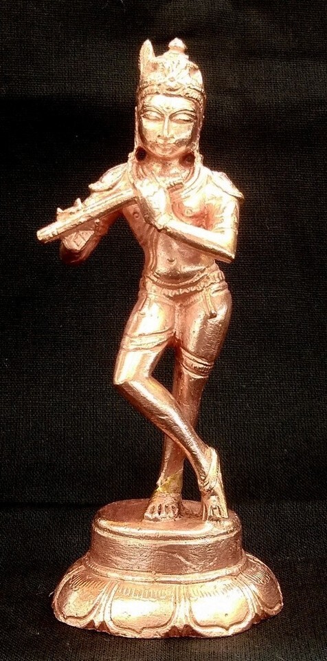 This Copper statue of Gopala Krishna is very impressive made in the hoysala style from artisians of south india stands in a relaxed position with one leg over the other playing the flute.