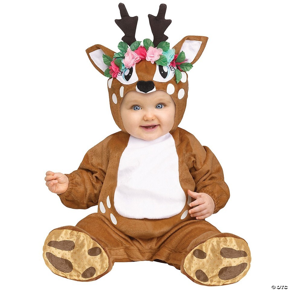 Oh, Deer Infant Toddler Costume: Your little one in this adorable reindeer outfit will be cuter than Rudolph. The costume features a brown jumpsuit with a white chest area and a hood adorned with flowers and antlers.