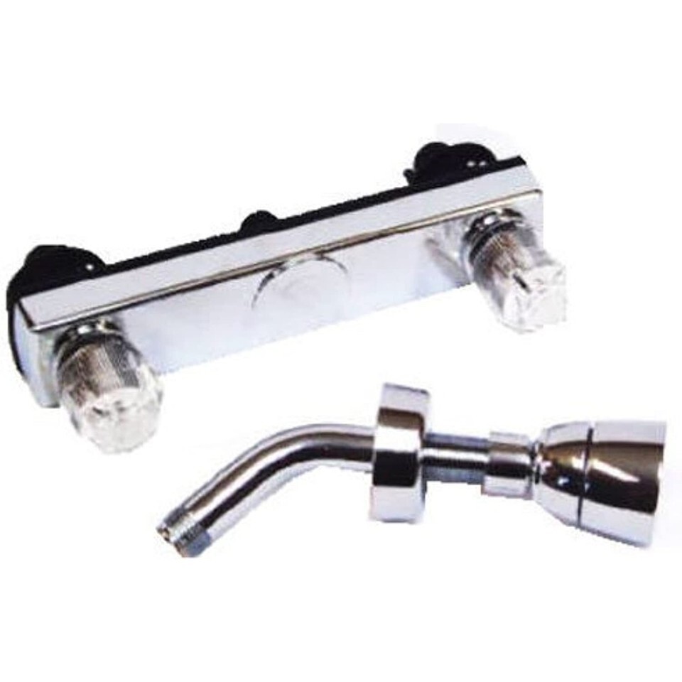 8", Shower Faucet, 2 Valve, Plastic Underbody, Clear Handles. Easily usable product. This product is manufactured in China.