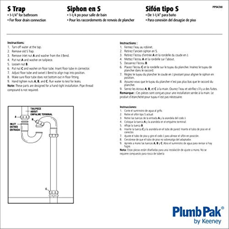 Plumb Pak s trap 1 1/4-Inch od has a durable plastic construction with a white finish. This slip-joint s-trap is designed for lavatory or kitchen connection to wall and supplied with 1-1/2-Inch and 1-1/4-Inch poly washers.