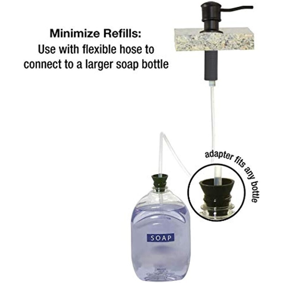 Product Description This Danco Oil Rubbed Bronze Soap Dispenser with straight nozzle provides an elegant touch for a bathroom or kitchen installation. Add convenience to your kitchen with this dispenser as it comes with a 48 in. hose that will fit a 1-gallon soap or 12 oz. lotion bottle discreetly hidden underneath the sink to minimize refills. This dispenser can also be filled from the top if used with the included under counter plastic soap container. The longer shank fits most counter tops, including granite and marble. From the Manufacturer Danco is one of the largest plumbing repair, replacement and remodel suppliers in the home improvement industry. We are largely focused on empowering Do It Yourself consumers with affordable plumbing products and solutions which create new and refreshing decors for bathrooms and kitchens.