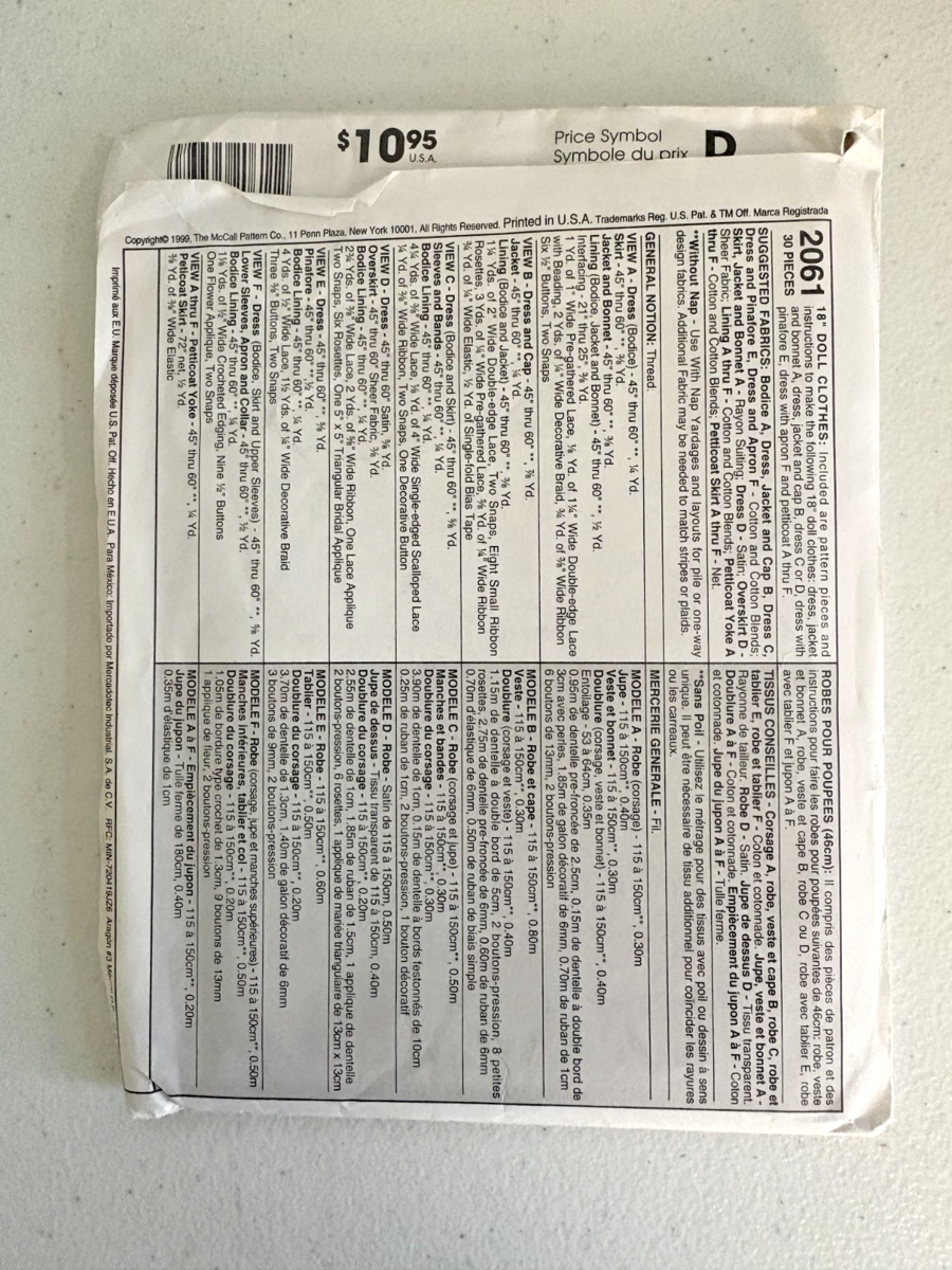 McCall's Crafts 2061 Pattern 18" Doll Clothes Uncut Vintage 1999. This is a new, uncut pattern - UPC #023795206112. See Photos for further description.