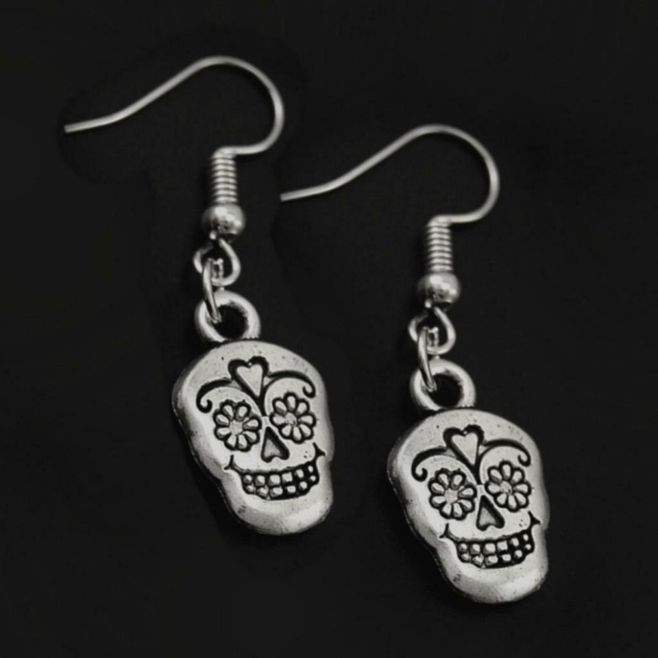 SUGAR SKULL EARRINGS 1.5" Day of the Dead Drop Dangle Stainless Steel Ear Wires