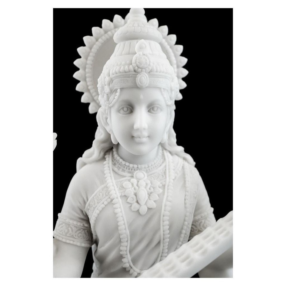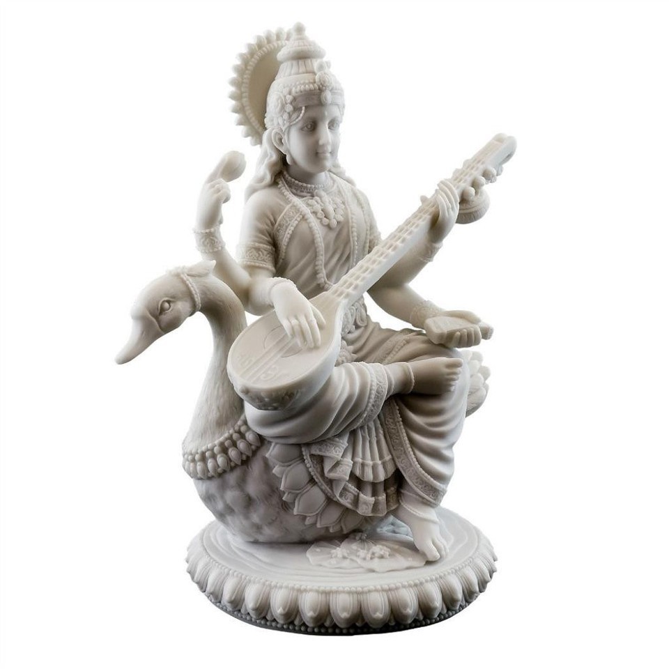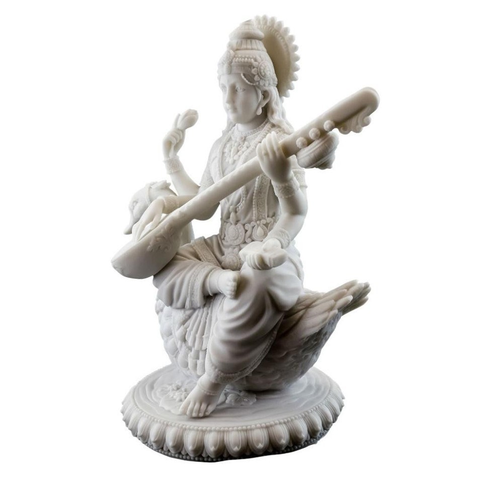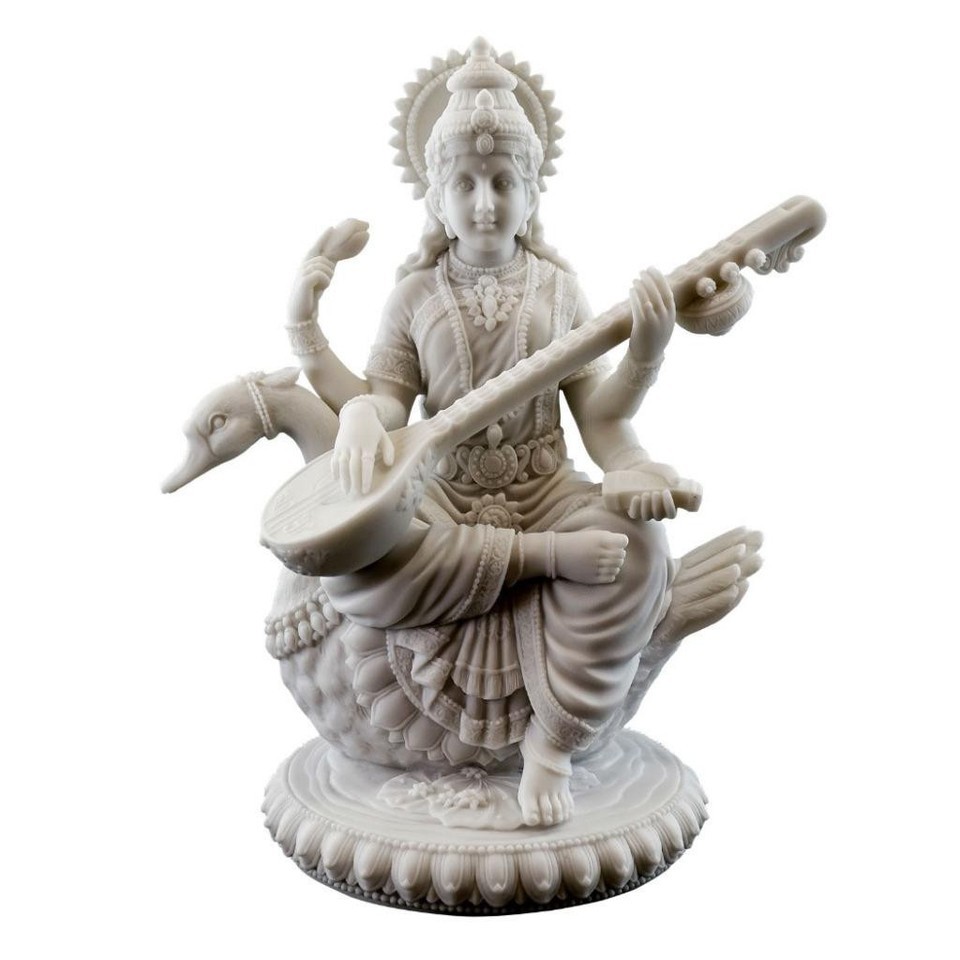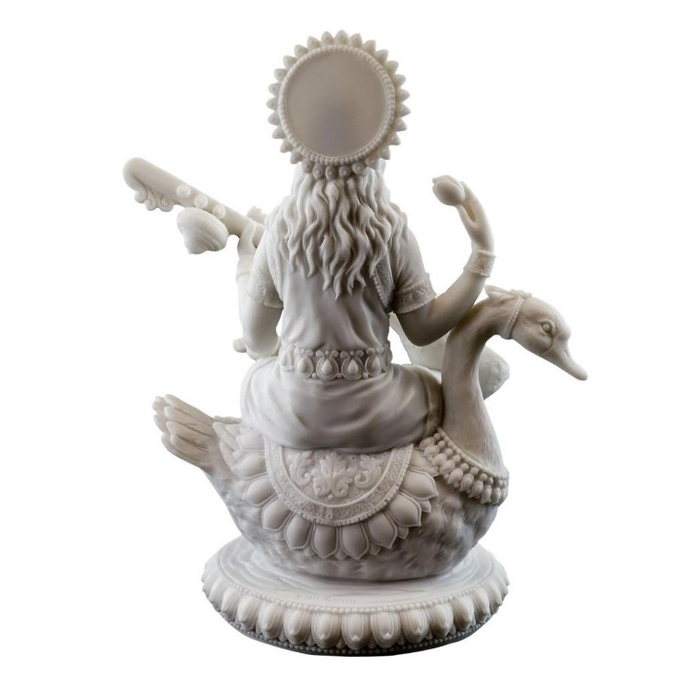 SARASWATI ON SWAN STATUE 8.5" Hindu Goddess Knowledge White Marble Finish Resin