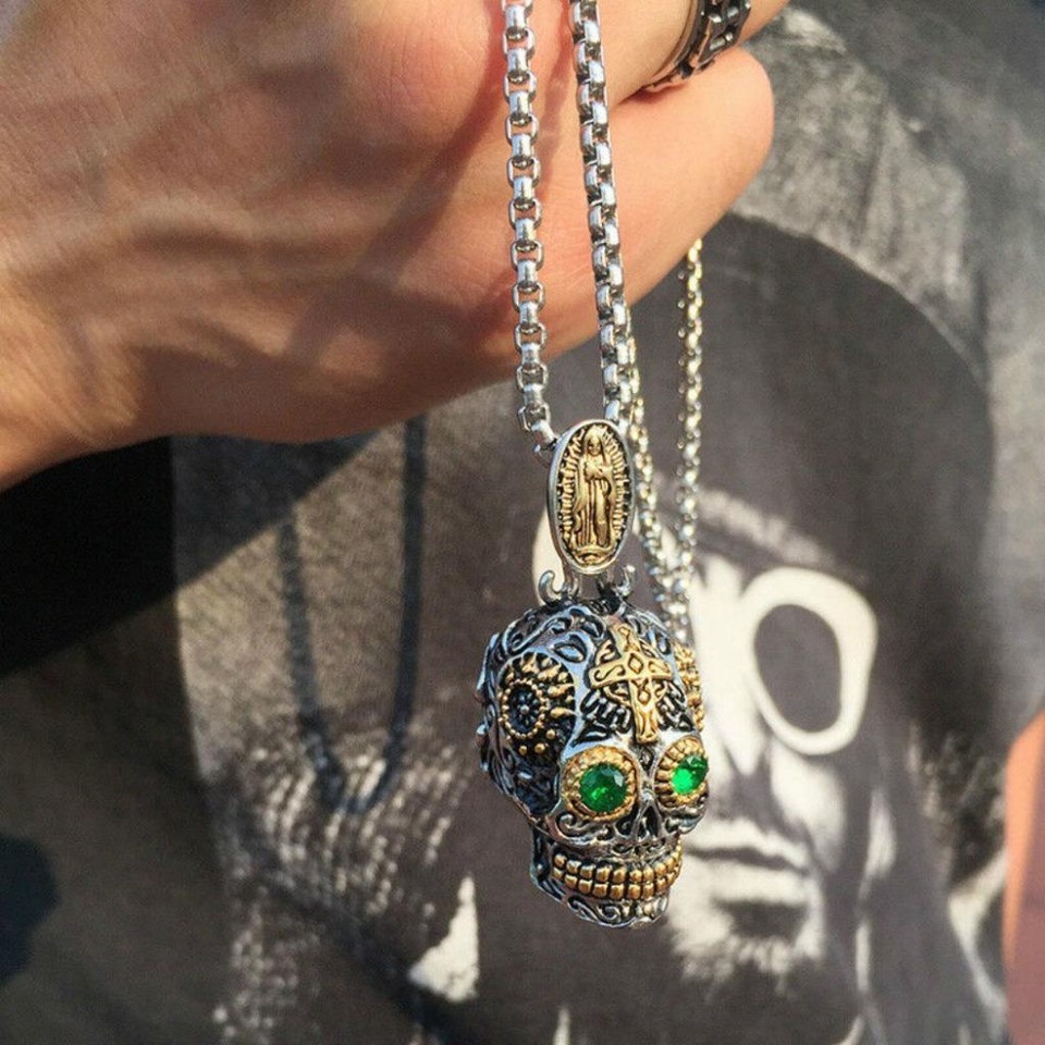 SUGAR SKULL NECKLACE Stainless Steel Mexican Day of the Dead Green Eyes Skeleton