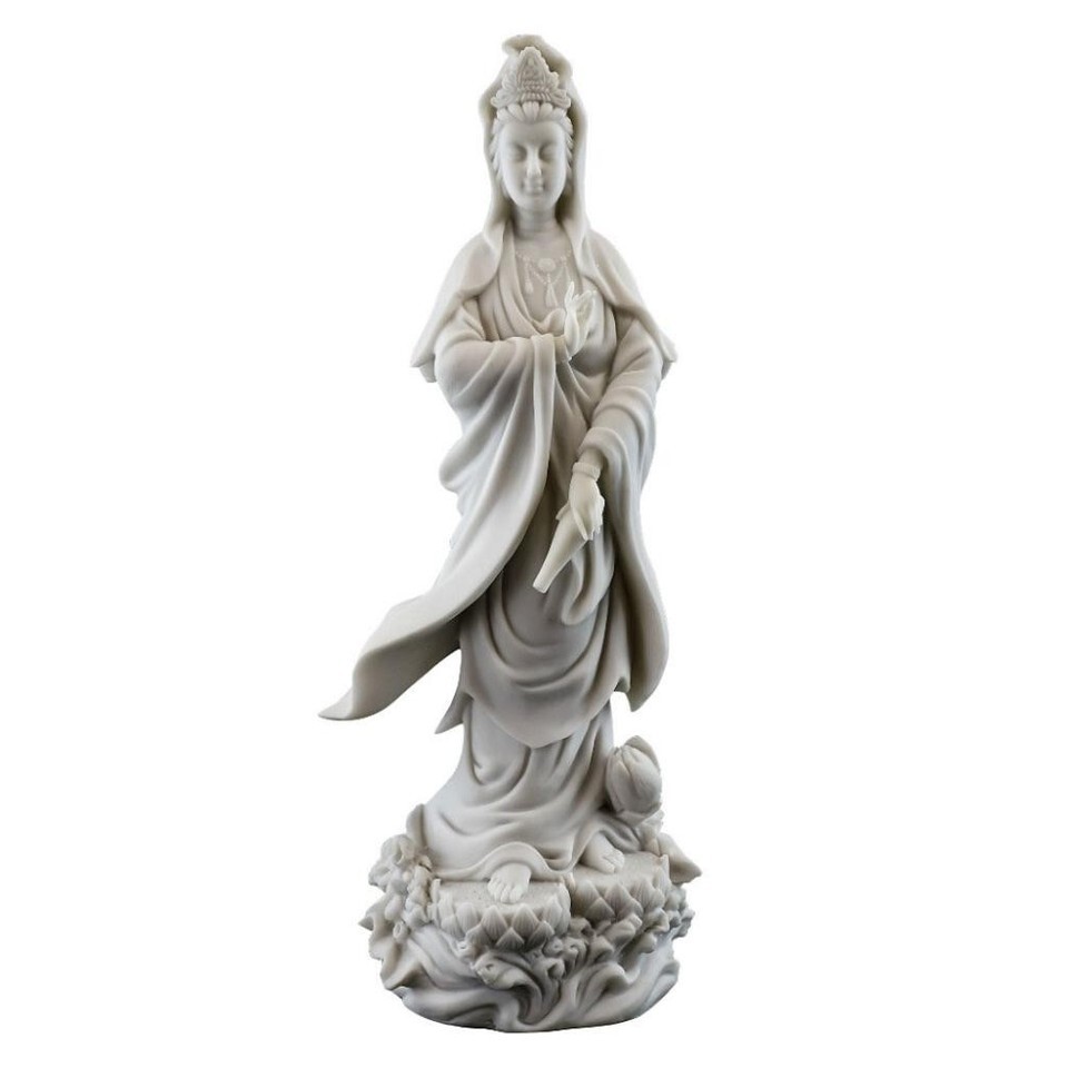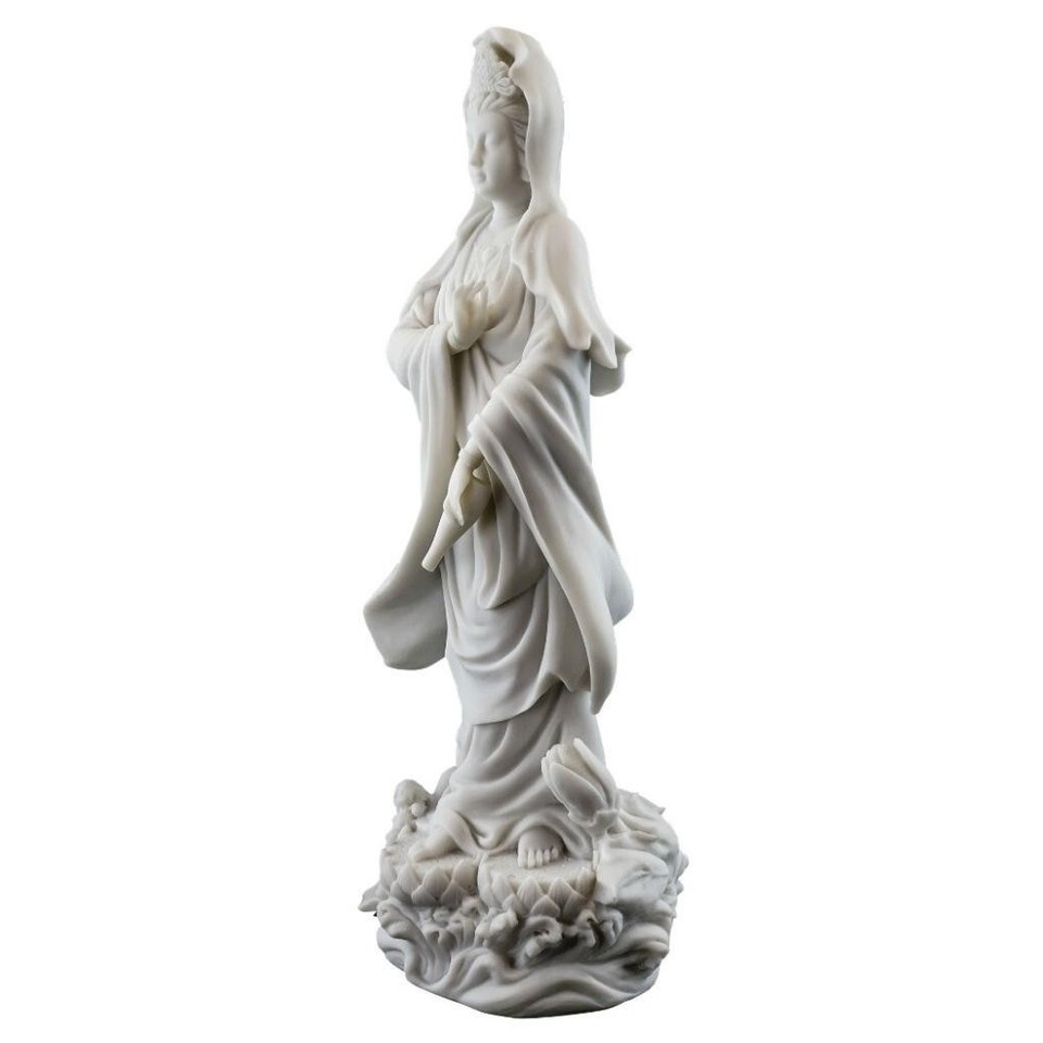 KWAN YIN ON LOTUS PEDESTAL STATUE 12.5" Buddhist Goddess White Marble Resin Quan