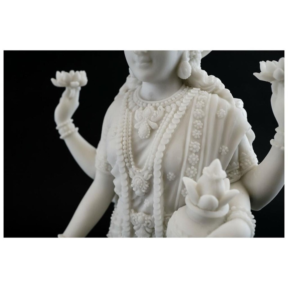 This beautiful statue of the Hindu Goddess Lakshmi is made from cold cast resin with crushed marble powder. It is made with superior craftsmanship and has excellent details and good weight.