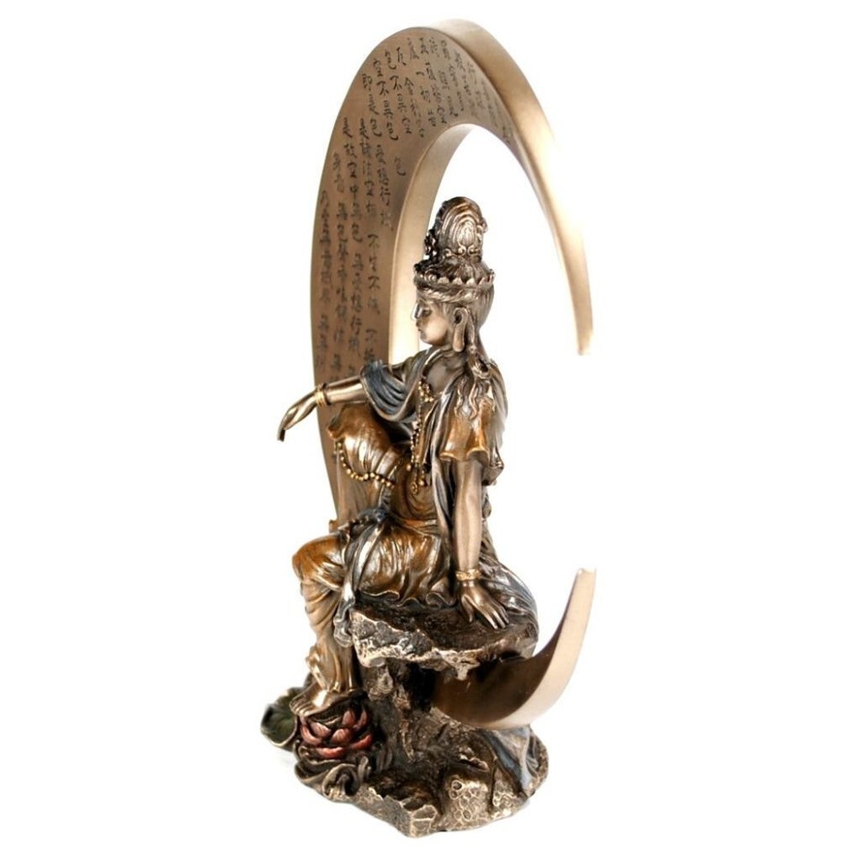 KWAN YIN on CRESCENT MOON STATUE 8.25" Buddhist Goddess Bronze Resin Quan Guan