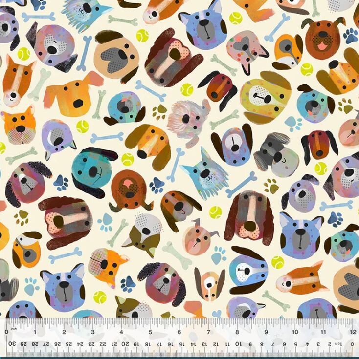 Cotton Fur-ever Friends Dog Faces Paw Bones Ivory Fabric Print by Yard D763.90