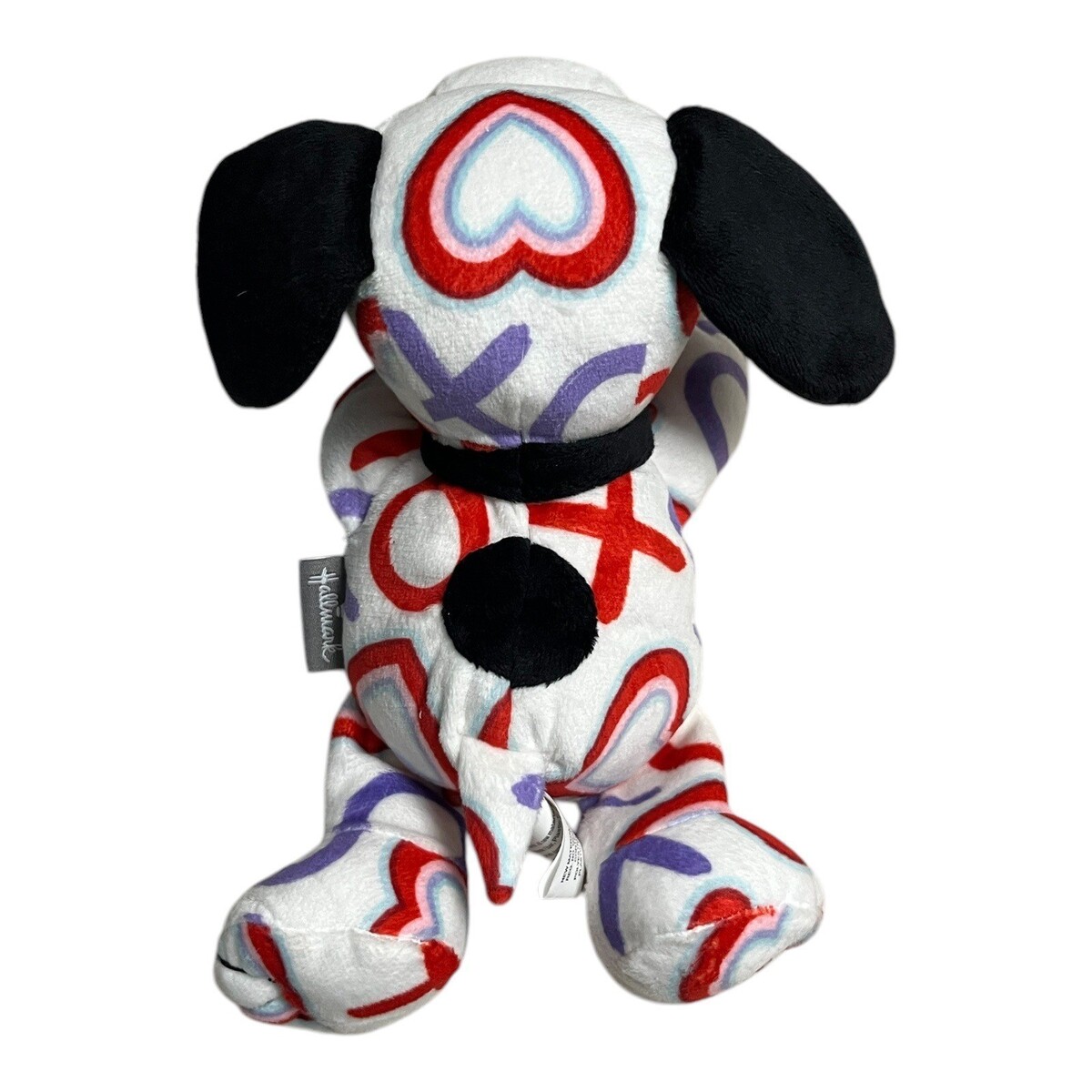 Hallmark Snoopy plush featuring an allover XO and heart pattern in red, purple, and blue. This Valentine-themed Snoopy has black ears, tail, and nose, with a soft plush feel and classic Peanuts styling. A sweet seasonal collectible or gift for Snoopy fans.