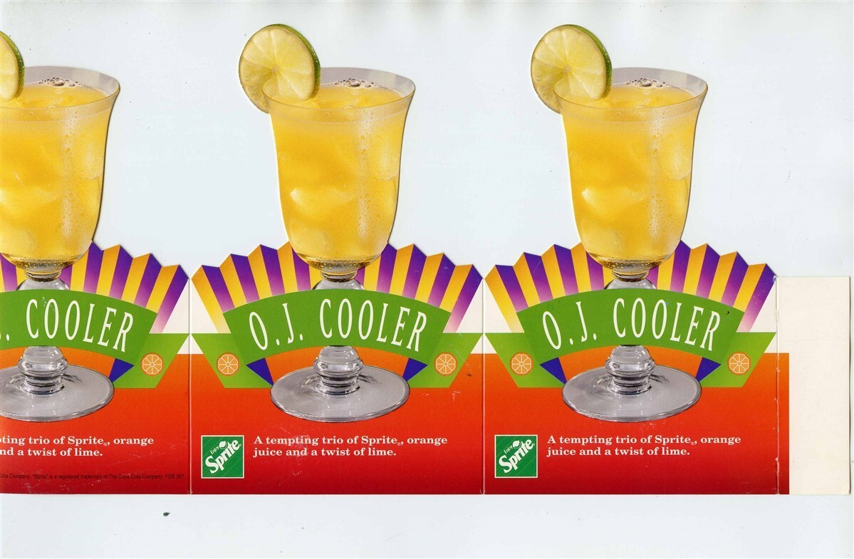 A very colorful Sprite Die Cut Table Top O J Cooler Adverting Piece. Measures about 6" x 13 3/8" when flat. Dated 1992. Made of heavy card stock